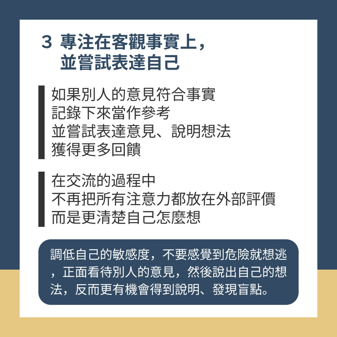 先調低自己的敏感度,不要感覺到危險就想逃跑,懂得正面看待別人的意見,然後說出自己的想法,反而有機會得到更進一步的說明、發現自己的盲點。