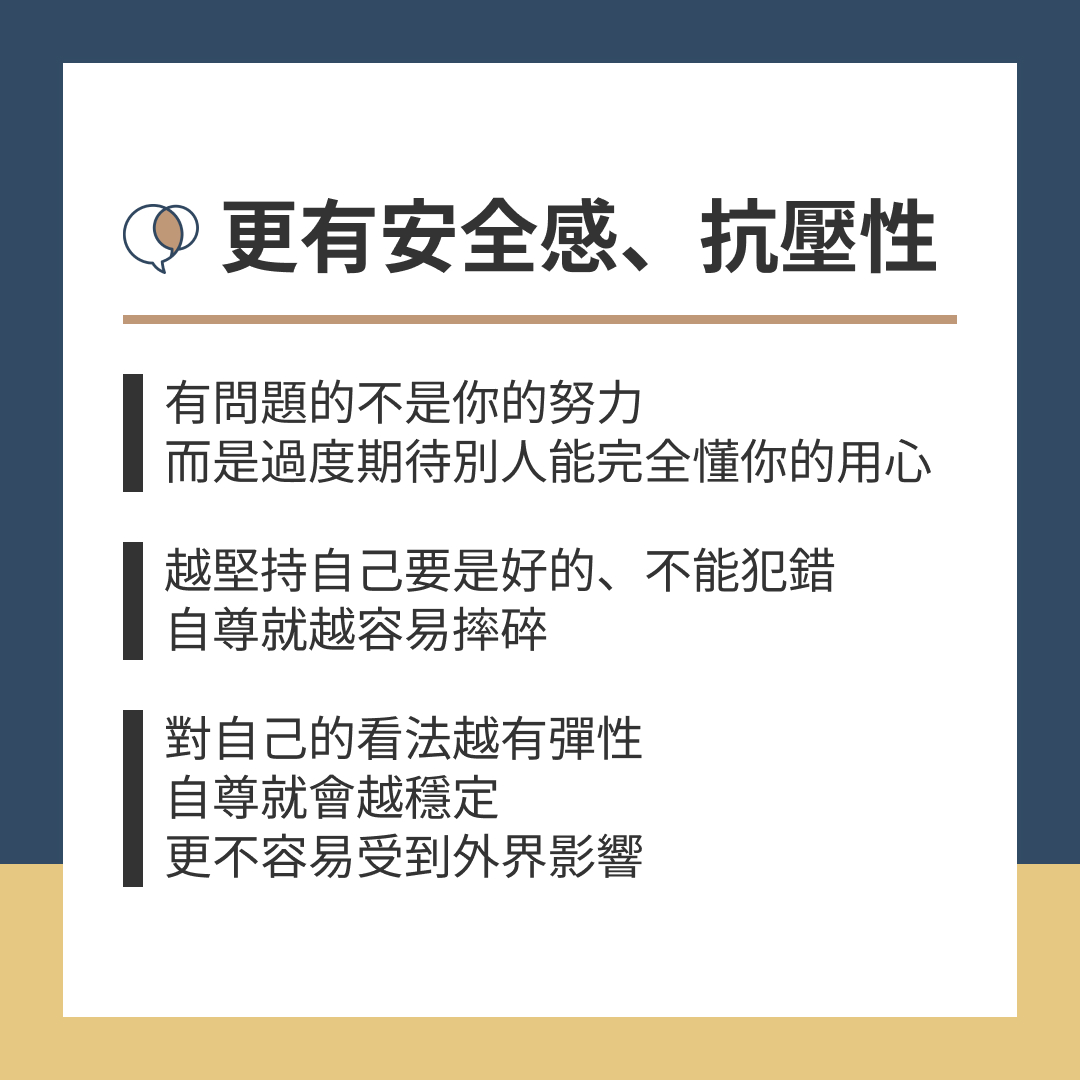 越堅持自己要是好的、不能犯錯,自尊就越容易摔碎;對自己的看法越有彈性,自尊就會越穩定,更不容易受到外界影響