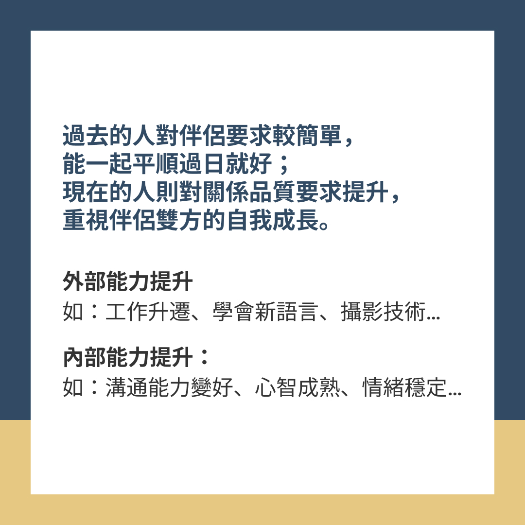 過去的人對伴侶要求較簡單,能一起平順過日就好;現在的人則對關係品質要求提升,重視伴侶雙方自我成長。