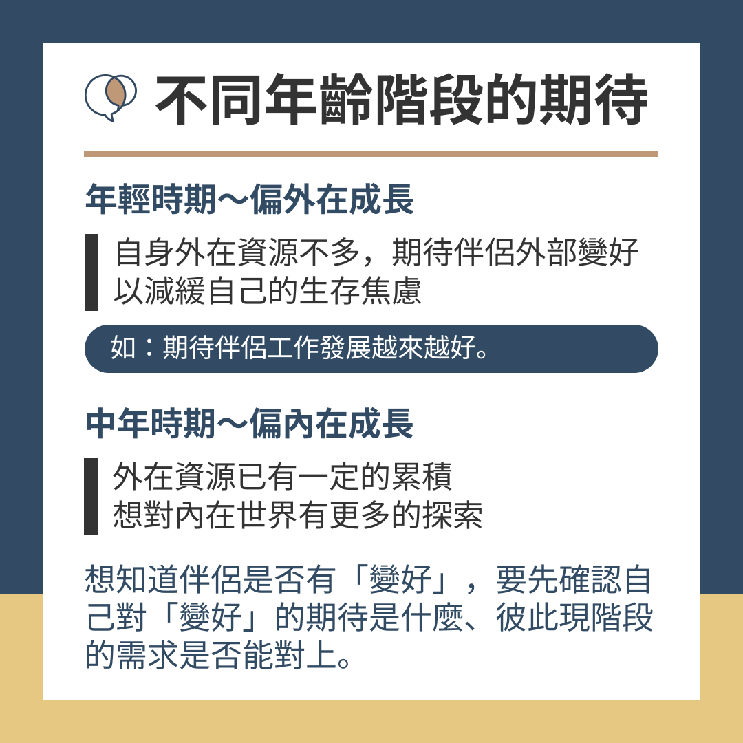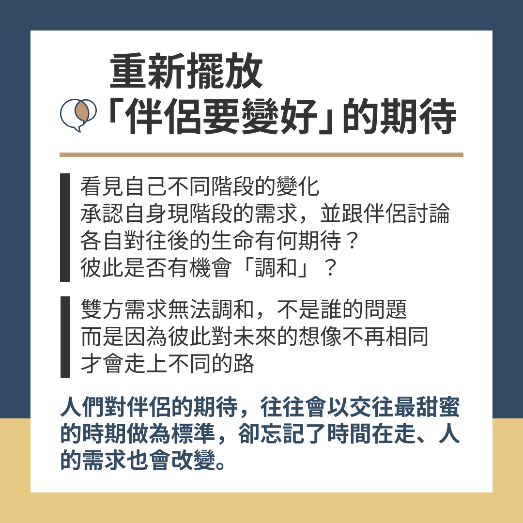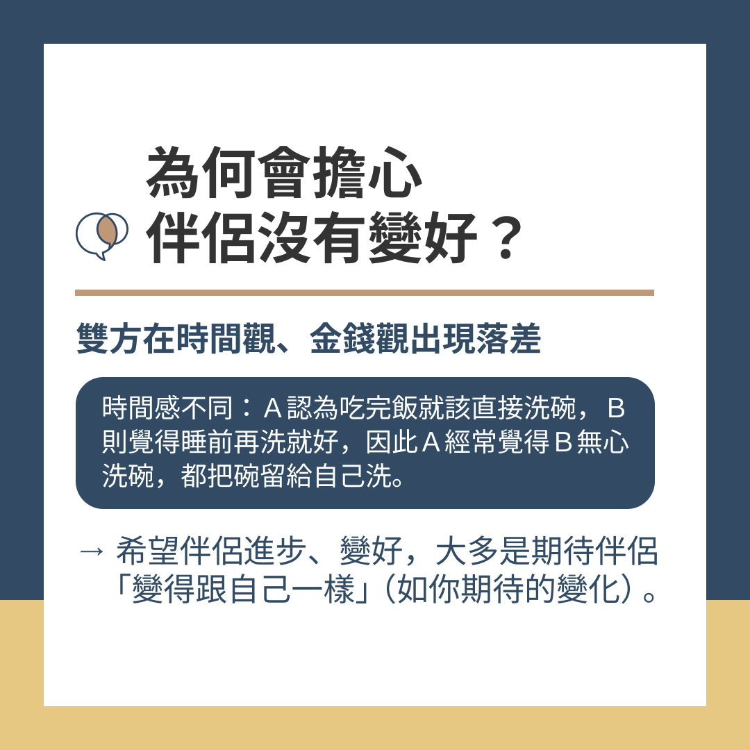 → 想知道伴侶是否有「變好」,要先確認自己對「變好」的期待是什麼,彼此現階段的需求是否能對上。