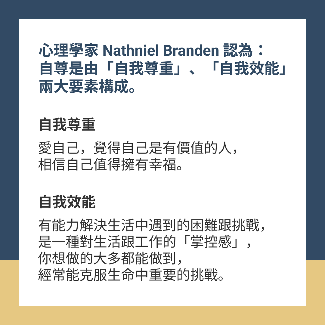 心理學家納撒尼爾·布蘭登(Nathniel Branden)認為,自尊是由「自我尊重」和「自我效能」兩大要素構成。