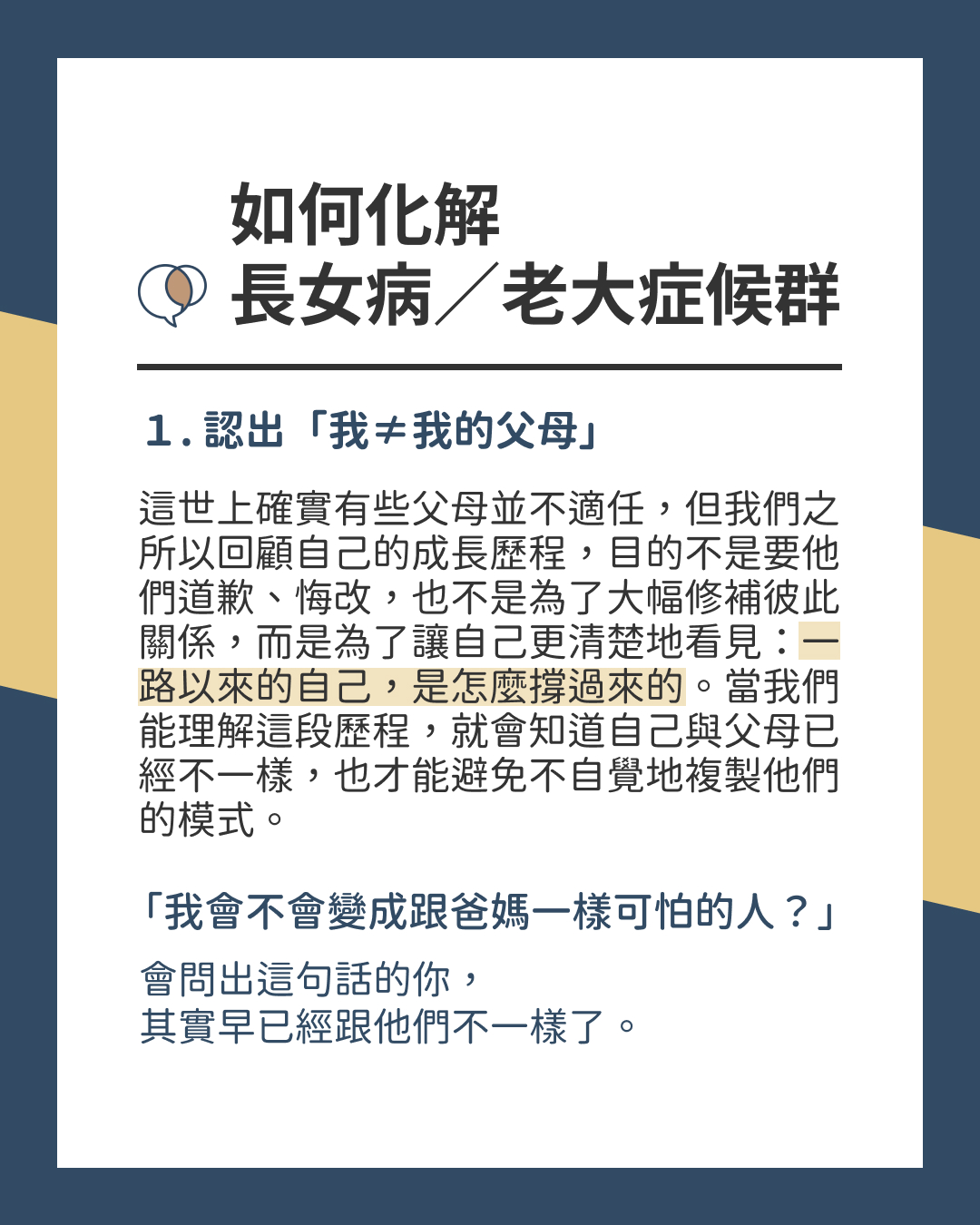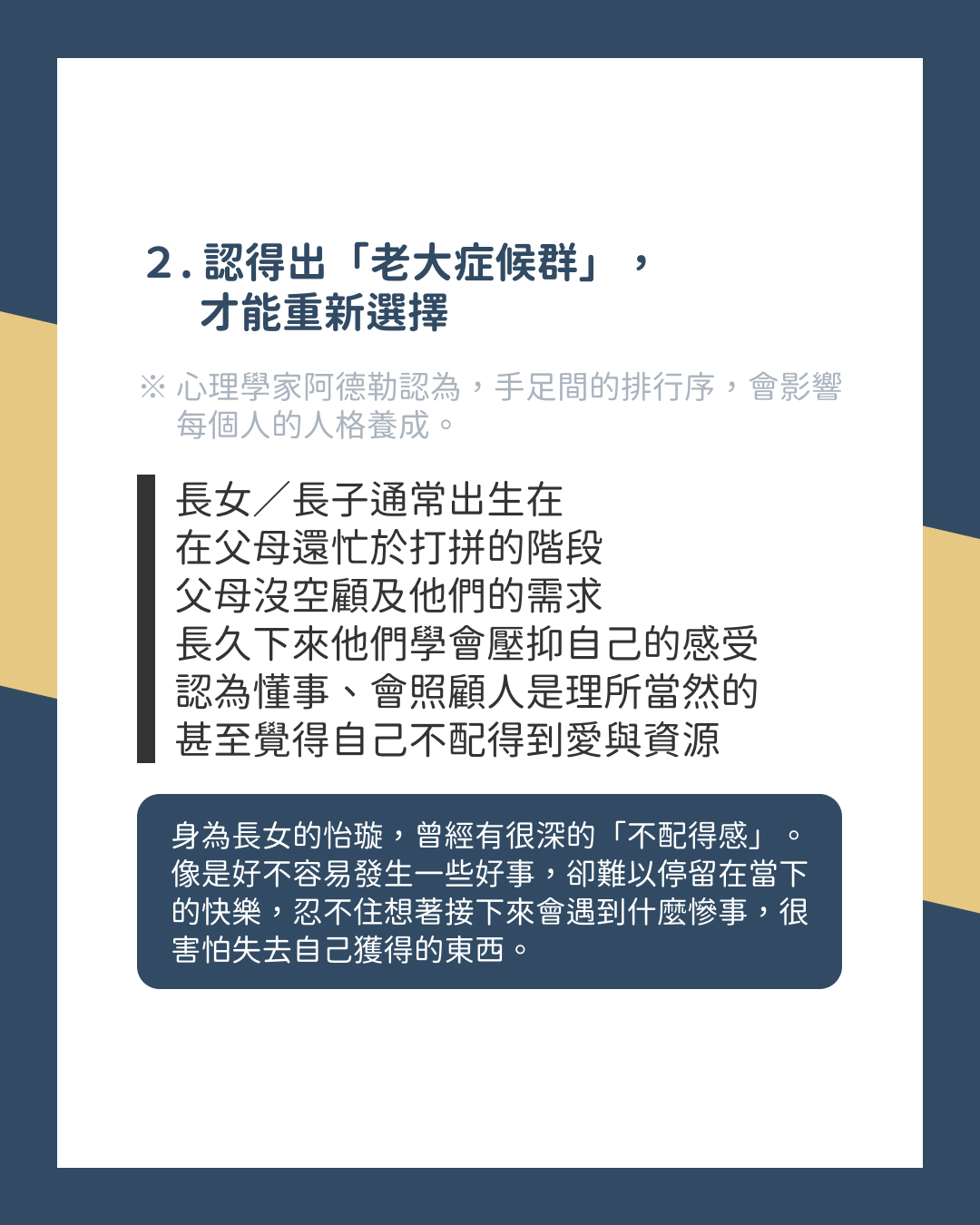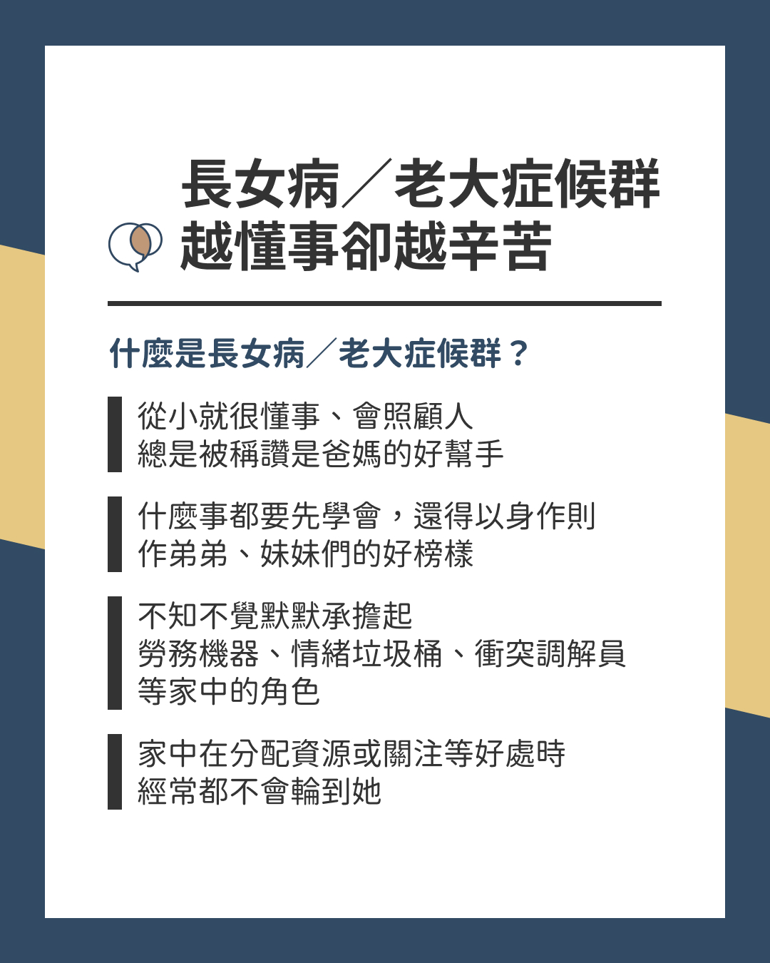 長女/長子通常在父母還忙於打拼的階段出生,父母沒空顧及他們的需求,長久下來他們學會壓抑自己的感受,認為懂事、會照顧人是理所當然的,甚至覺得自己不配得到愛與資源