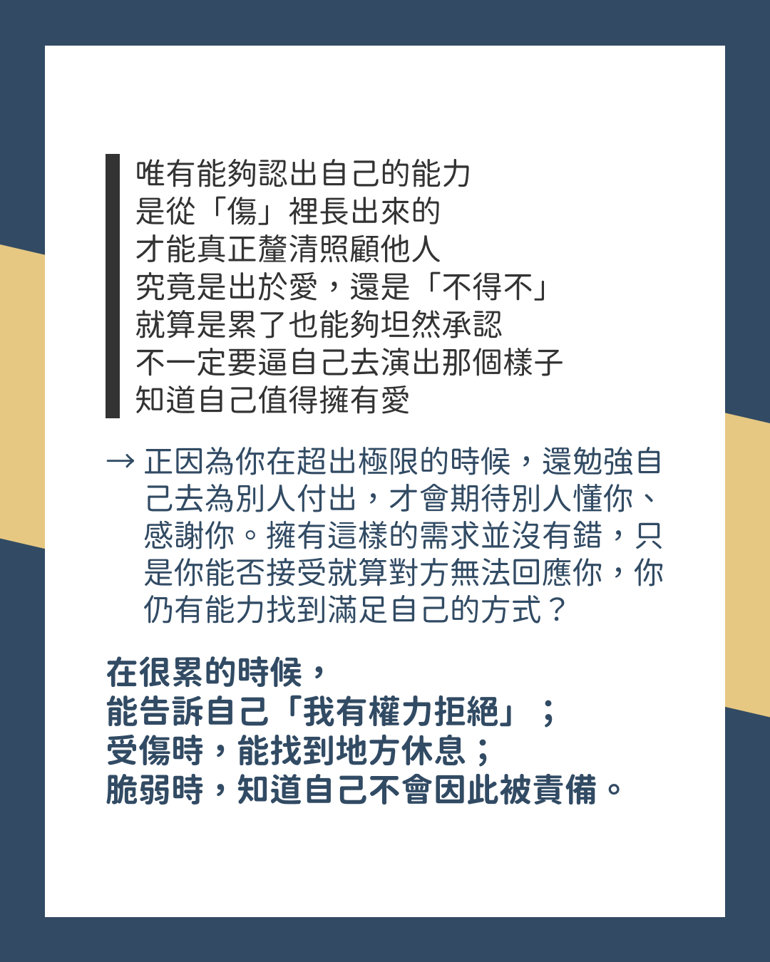唯有能夠認出自己的能力是從「傷」裡長出來的,才能真正釐清照顧他人,究竟是出於愛,還是不得不;就算是累了也能夠坦然承認,不一定要逼自己去演出那個樣子,知道自己值得擁有愛