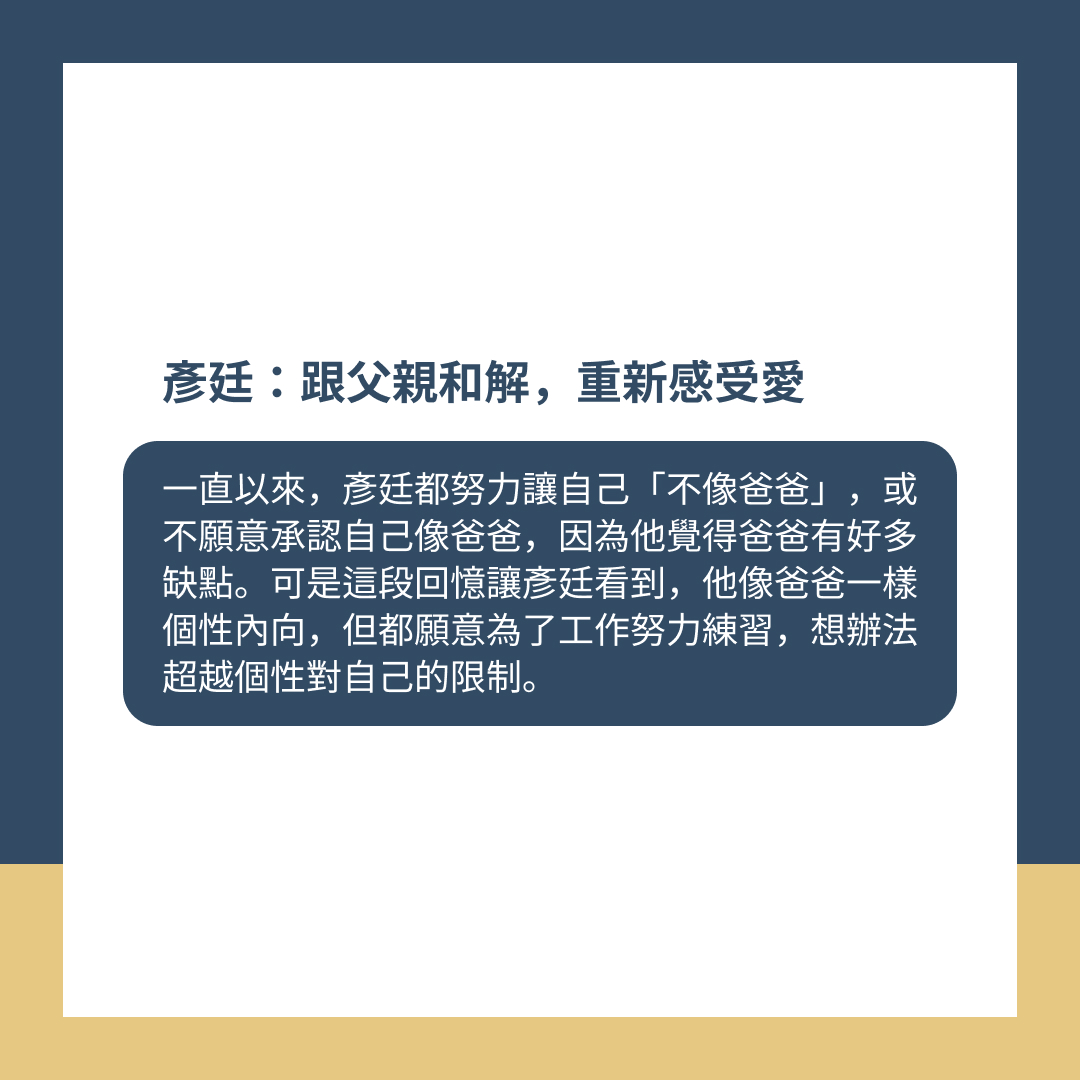 一直以來,彥廷都在努力讓自己不像爸爸,或不願意承認自己像爸爸,因為他覺得爸爸有好多缺點。可是這段回憶讓彥廷看到,他像爸爸一樣個性內向,但都願意為了工作努力練習,想辦法超越個性對自己的限制。