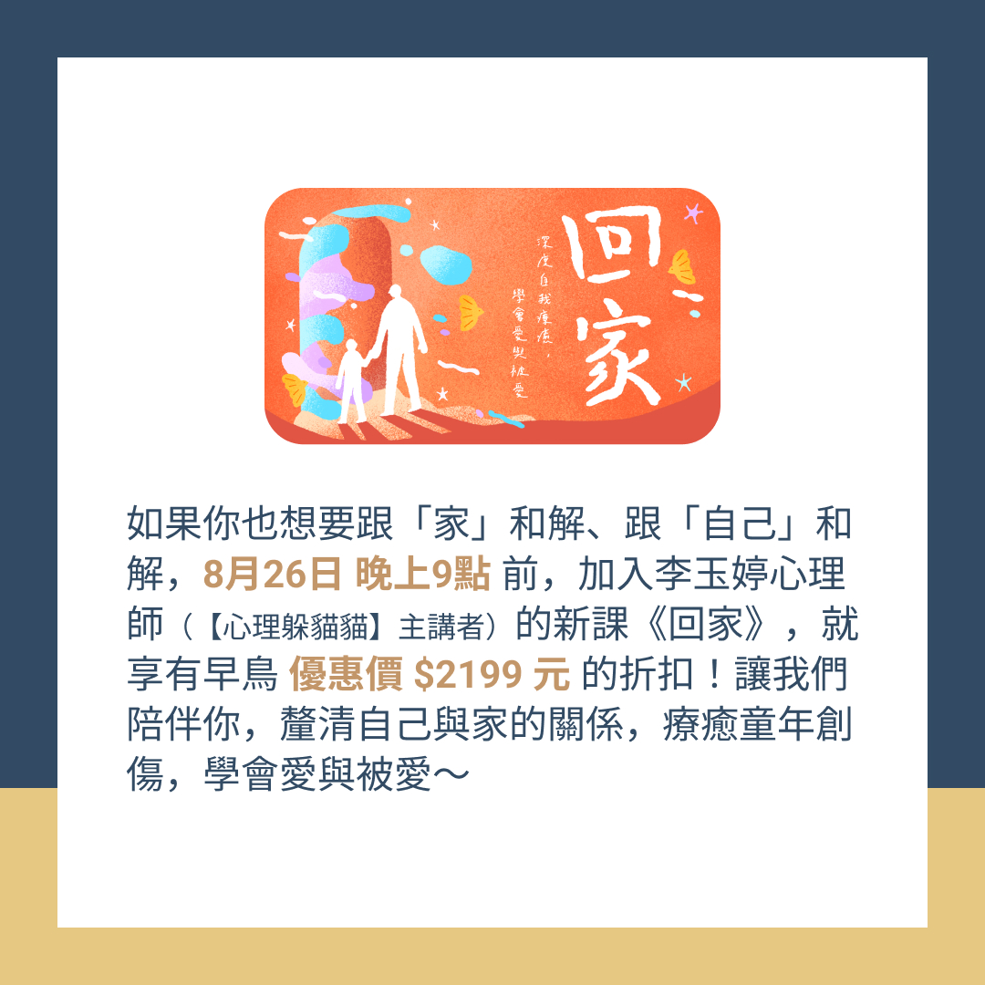 如果你也想要跟「家」和解、跟「自己」和解,8月26日晚上9點前,加入玉婷老師的新課《回家》,就享有早鳥優惠價$2199元的折扣!
