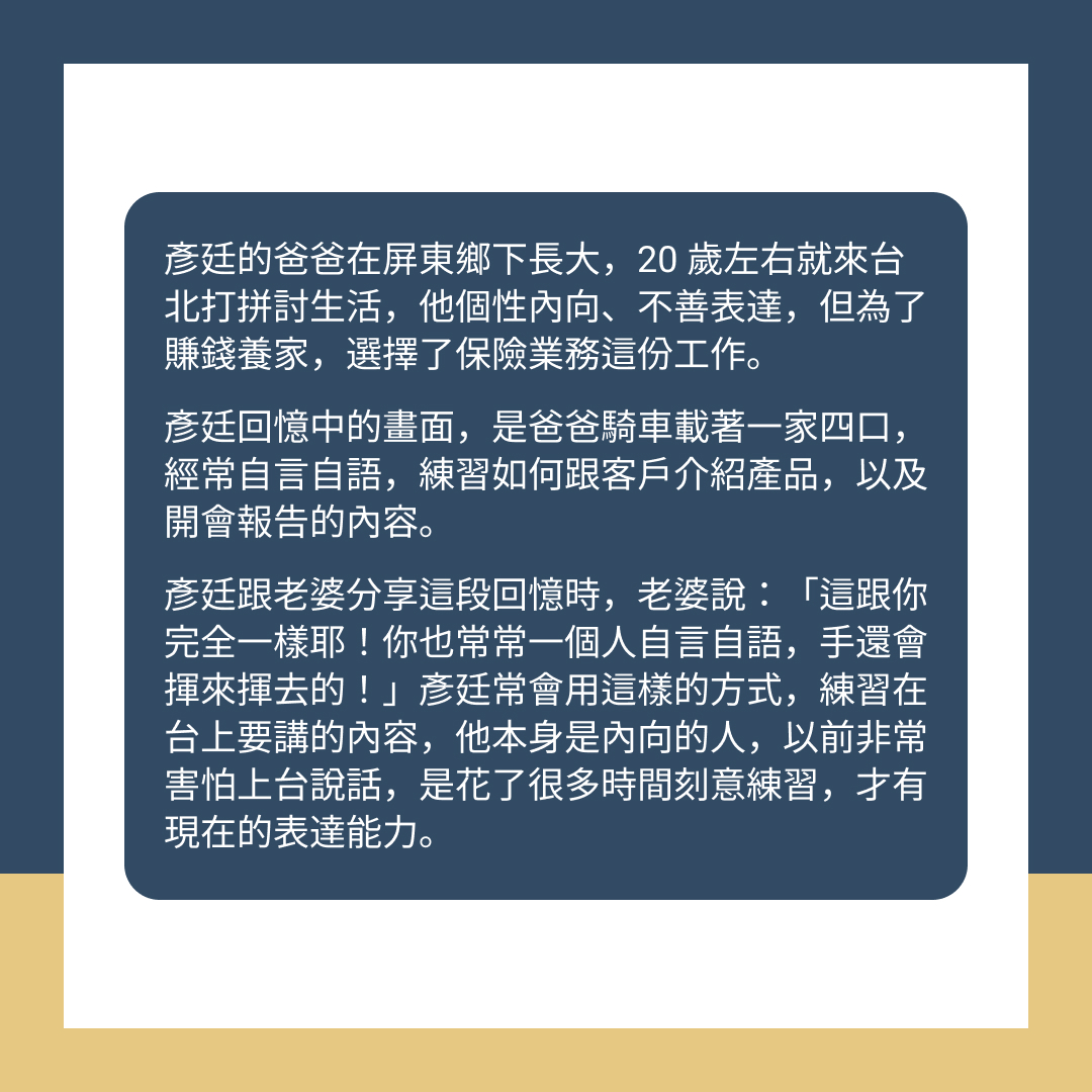 彥廷的爸爸在屏東鄉下長大,20歲左右就來台北打拼討生活,他個性內向、不善表達,但為了賺錢養家,選擇了保險業務這份工作。