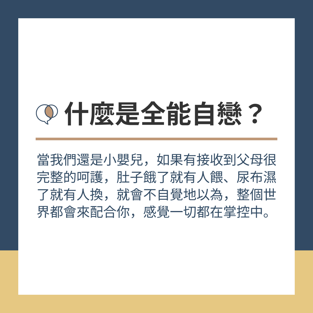 「全能自戀」是嬰兒才會有的心理狀態,少數人可能到長大之後還有,於是變成「巨嬰」;更多人會在成長的過程漸漸發現,原來有很多事情不能自己控制(如:哭的時候,不一定會有人馬上來照顧你,讓你開始意識到父母是父母、你是你,而你無法真正控制父母的行為