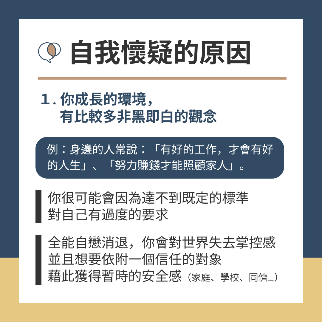 自我懷疑是很棒的特質,因為當你做決定時願意透過思考,重新檢視自己的觀念和想法,可以讓你跳脫框架,做出不一樣的改變,但如果你面對挑戰的時候,經常覺得自己辦不到,影響了做事的心態,生活可能就會變得很辛苦。