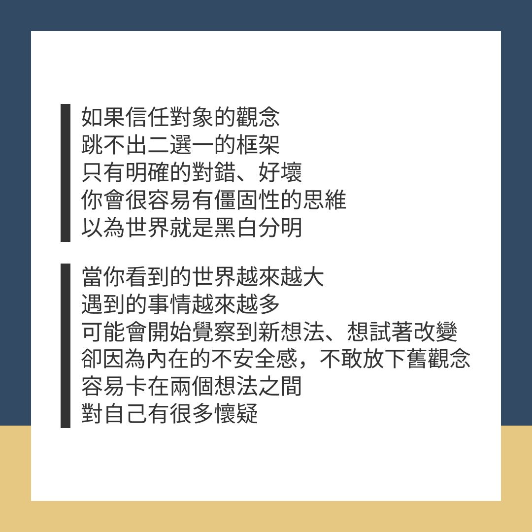 如果信任對象的觀念,跳不出二選一的框架,只有明確的對錯、好壞,你會很容易有僵固性的思維,以為世界就是黑白分明