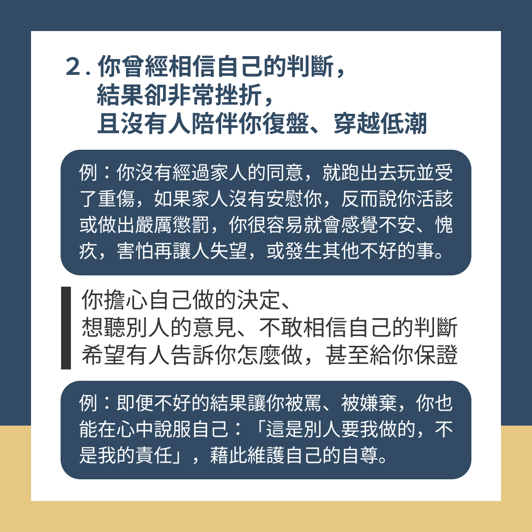 例:你曾經沒有經過家人的同意,自己跑出去玩,卻遇到很嚴重的意外、受了重傷,這時如果身旁的人沒有安慰你,反而說你不聽話、活該,或做出嚴厲懲罰,你很容易就會感覺不安、愧疚,害怕再讓別人失望,或發生其他不好的事情。