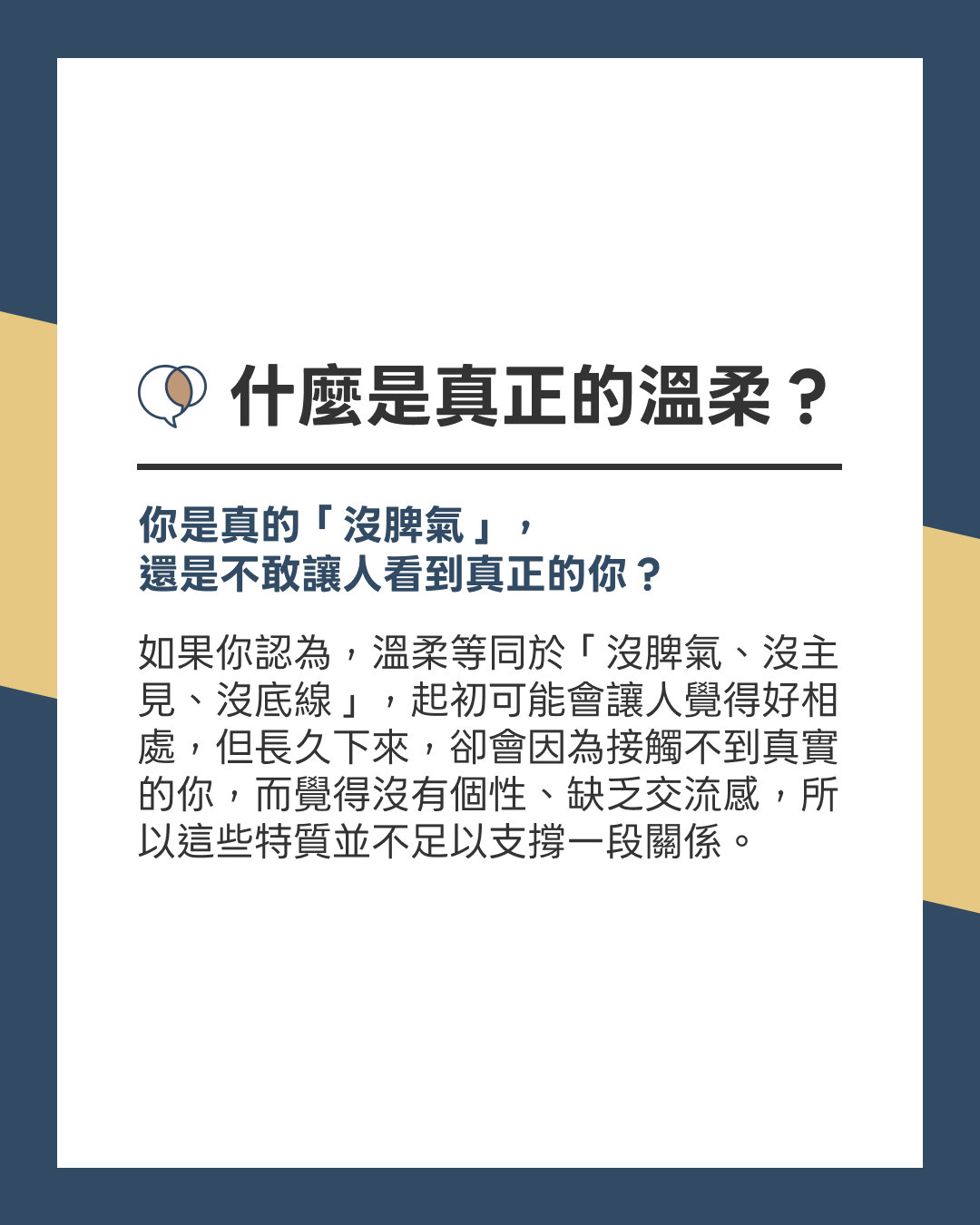 如果認為溫柔等同於「沒脾氣、沒主見、沒底線」,起初可能會讓人覺得好相處,但長久下來,卻會因為接觸不到真實的你,而覺得沒有個性、缺乏交流感,所以這些特質並不足以支撐一段關係