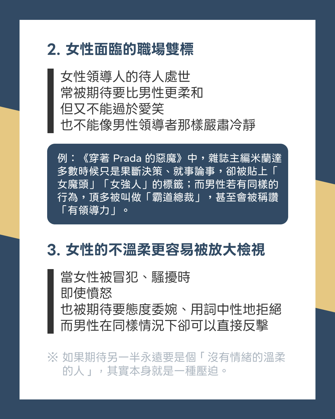 例:《穿著Prada的惡魔》裡的雜誌主編米蘭達,多數時候只是果斷決策、就事論事,卻被貼上「女魔頭」「女強人」的標籤;而男性若有同樣的行為,頂多被叫做「霸道總裁」,甚至會被稱讚「有領導力」。