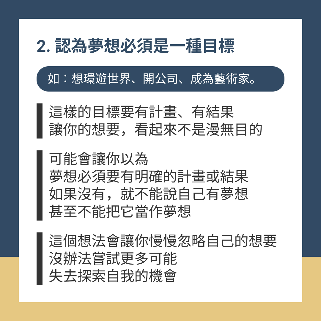 這樣的信念,可能會讓你以為「夢想必須要有明確的計畫或結果,如果沒有,就不能說自己有夢想,甚至不能把它當作「夢想」