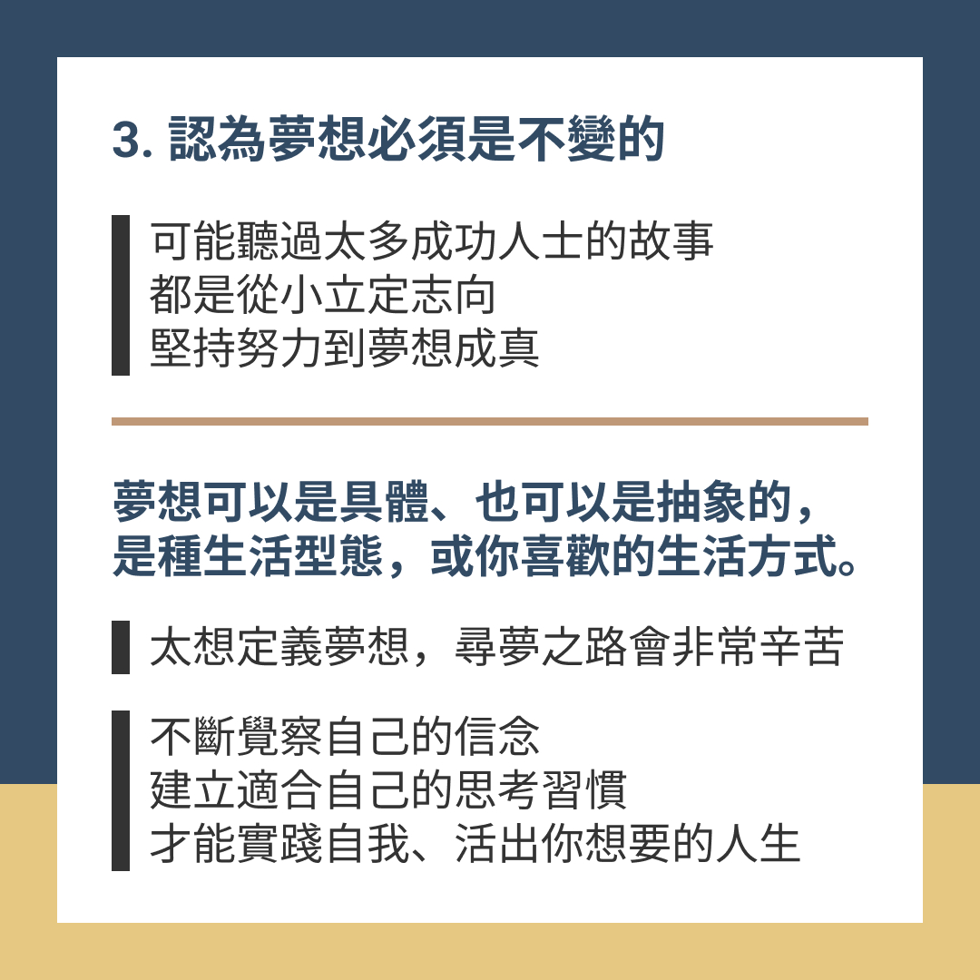 聽到別人都有夢想,所以告訴自己「我應該要有夢想」,就會讓自己壓力很大,然後逼自己長出「讓別人認同的夢想」,最後只專注在給人交代,而忽略自己真正的想要。