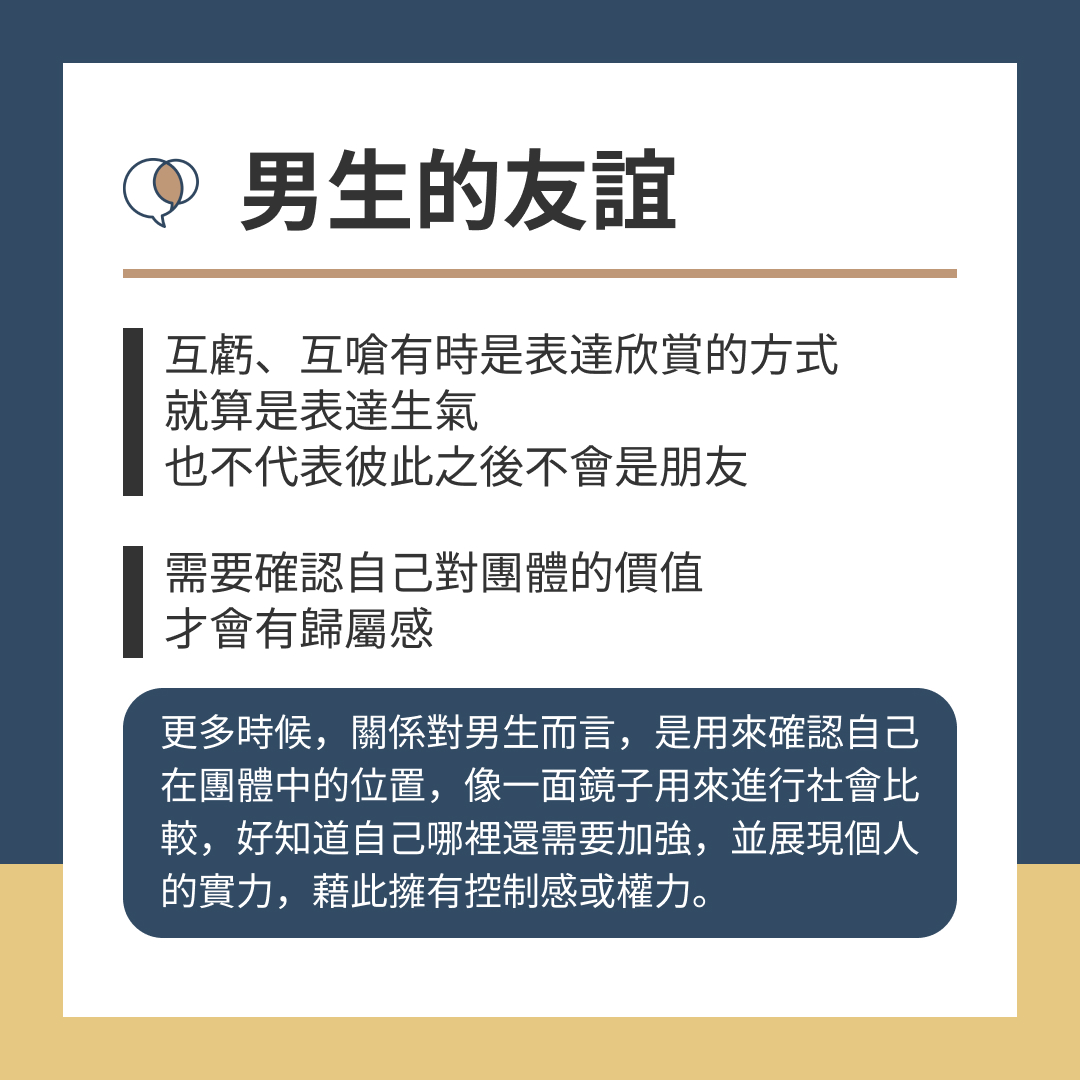 更多時候,關係對男生而言,是用來確認自己在團體中的位置,像一面鏡子用來進行社會比較,好知道自己哪裡還需要加強,並展現個人的實力,藉此擁有控制感或權力