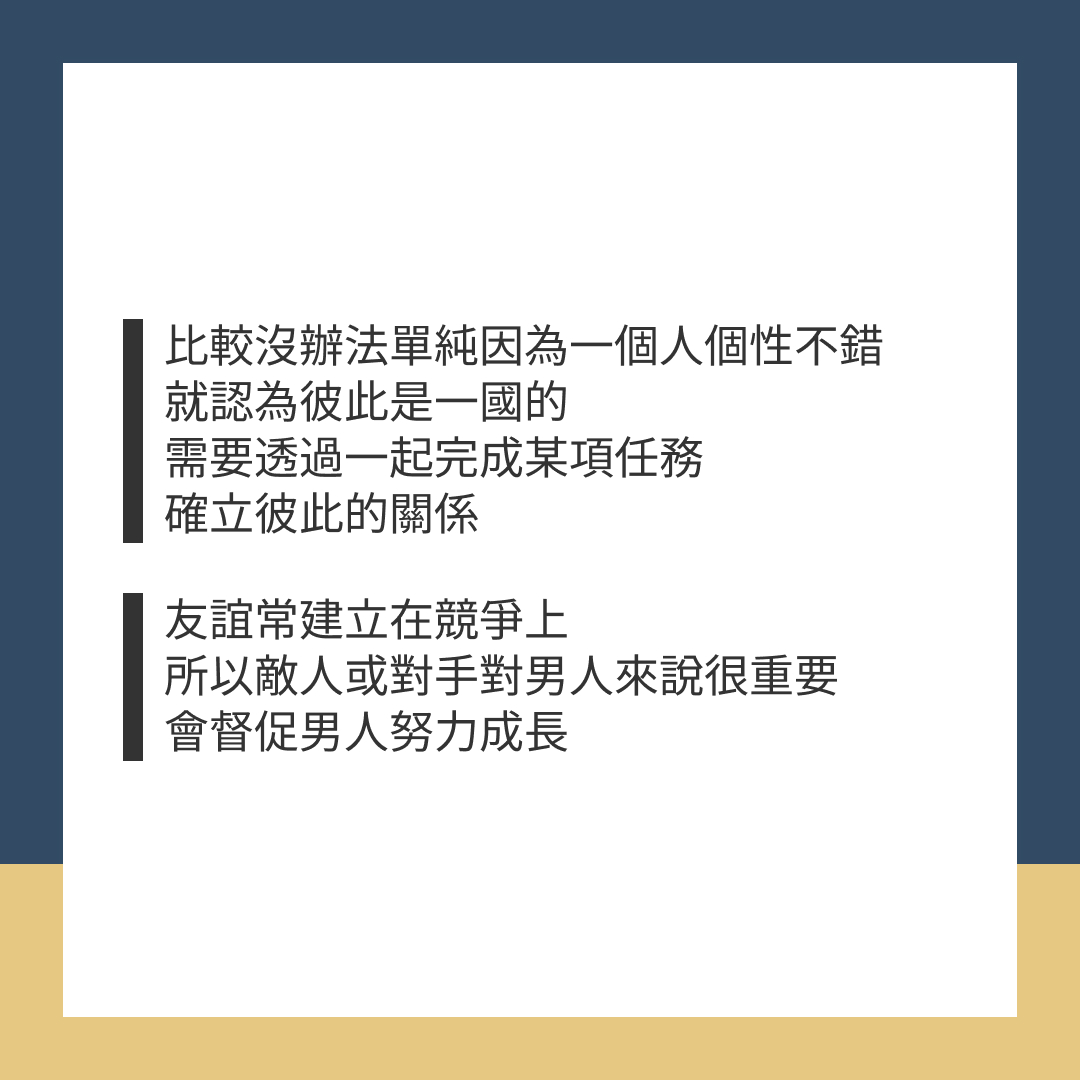 男人的友誼建立在競爭上,所以「敵人」或「對手」對男人很重要,他們會督促男人努力成長