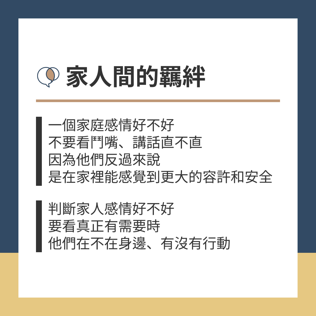 看一個家庭感情好不好,不要看鬥嘴、講話直不直,因為反過來說,是在家裡能感覺到比較大的容許和安全