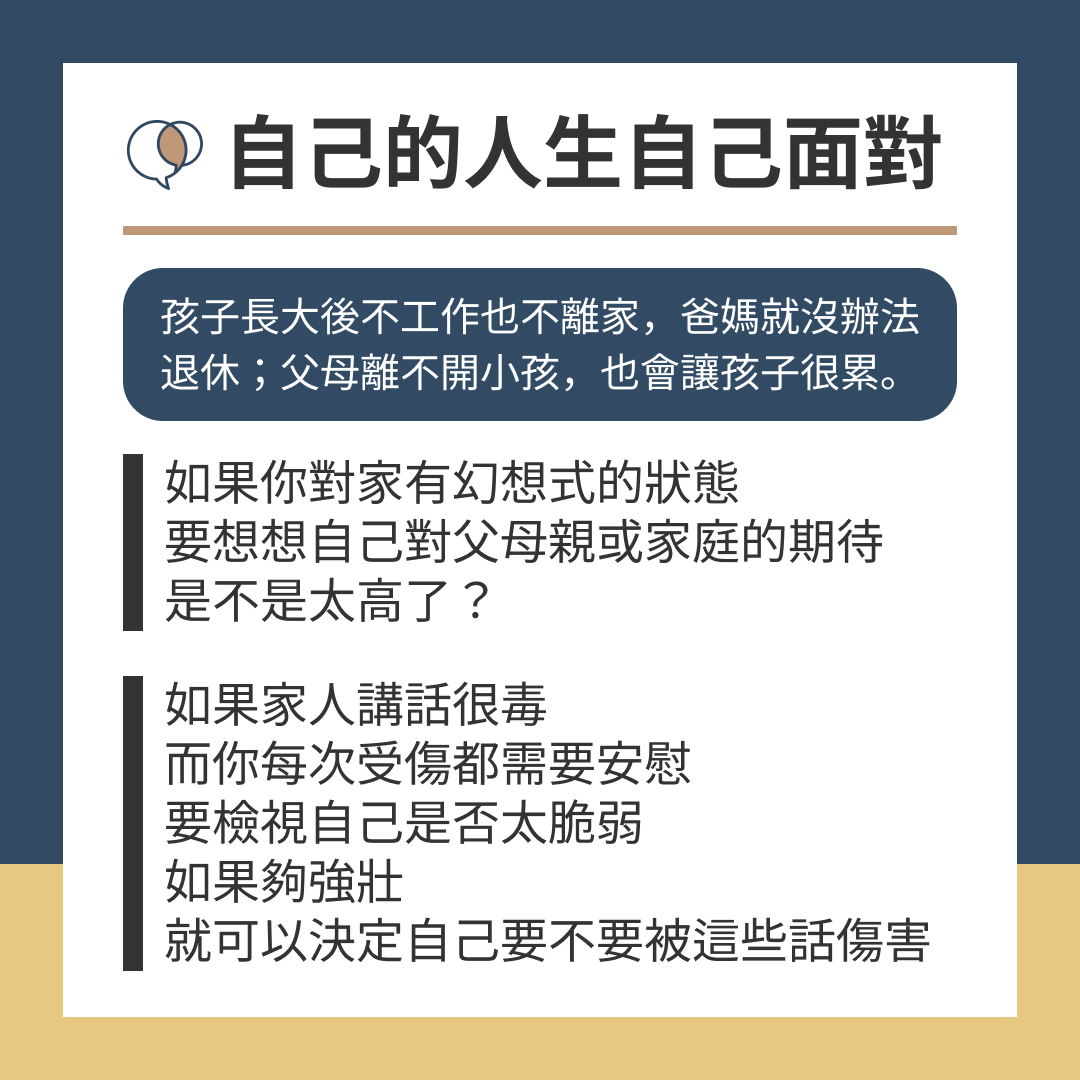 孩子長大後不工作也不離家,爸媽就沒辦法退休;父母親離不開小孩,也會讓孩子非常累。