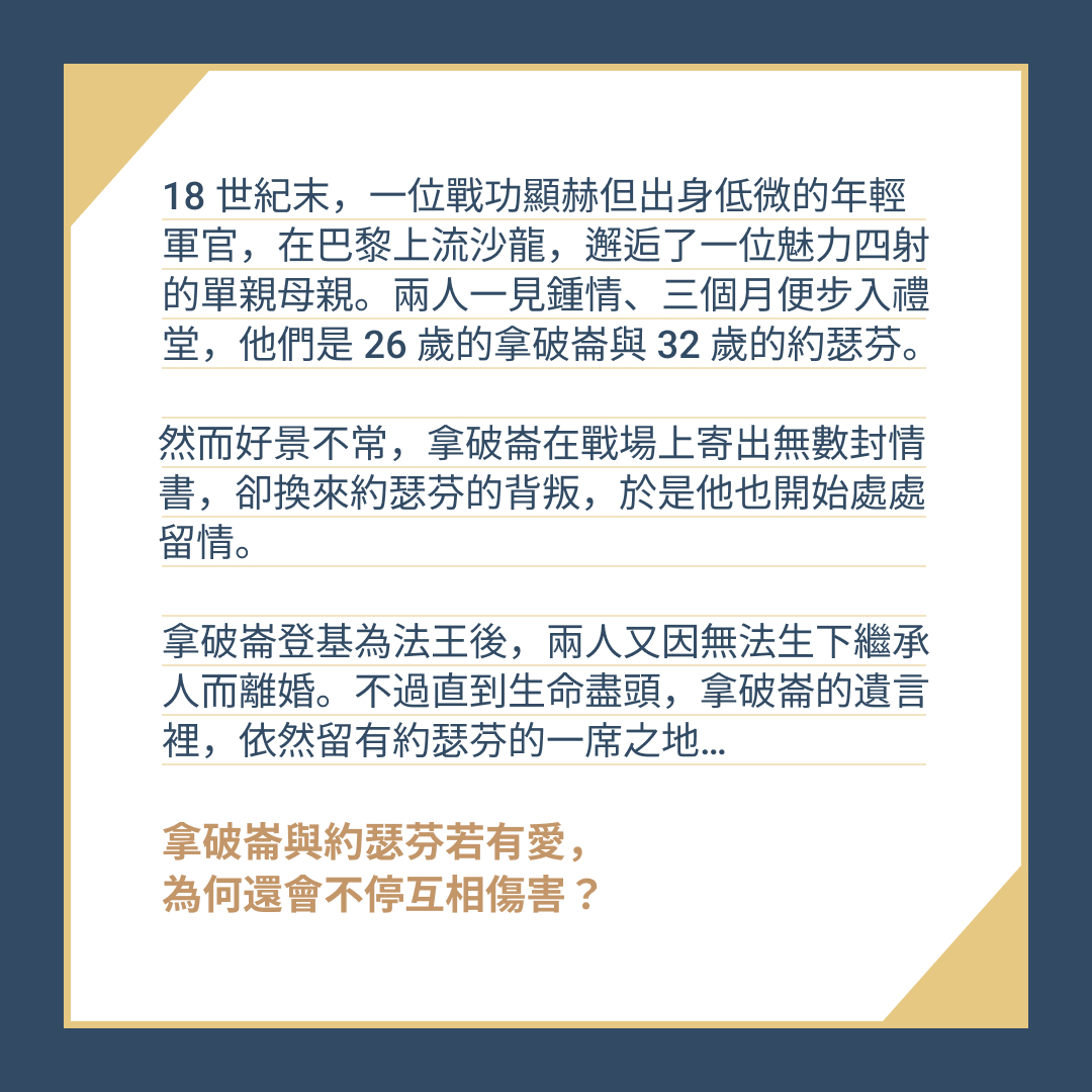 離婚後,拿破崙很快再婚並生下繼承人,但他仍會定期拜訪約瑟芬,直到1814年戰敗退位,約瑟芬不久後驟逝。 七年後拿破崙離世,他在遺言中留下三個詞:「法國、軍隊、約瑟芬」,為這段充滿愛與波折的故事畫下句點。