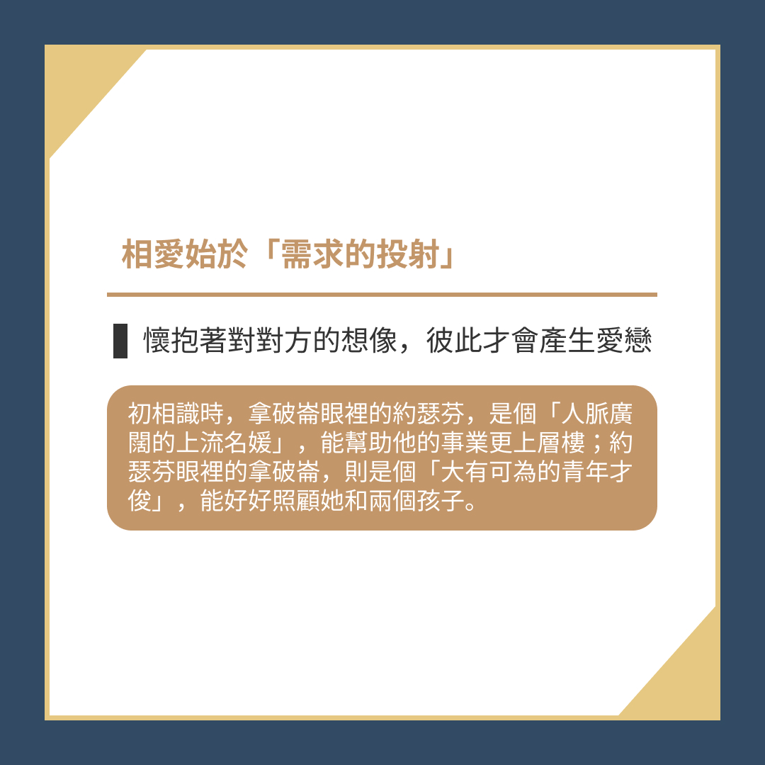 初相識時,拿破崙眼裡的約瑟芬是個「人脈廣闊的上流名媛」,能幫助他的事業更上一層樓;約瑟芬眼裡的拿破崙則是個「大有可為的青年才俊」,能好好照顧她和兩個孩子。