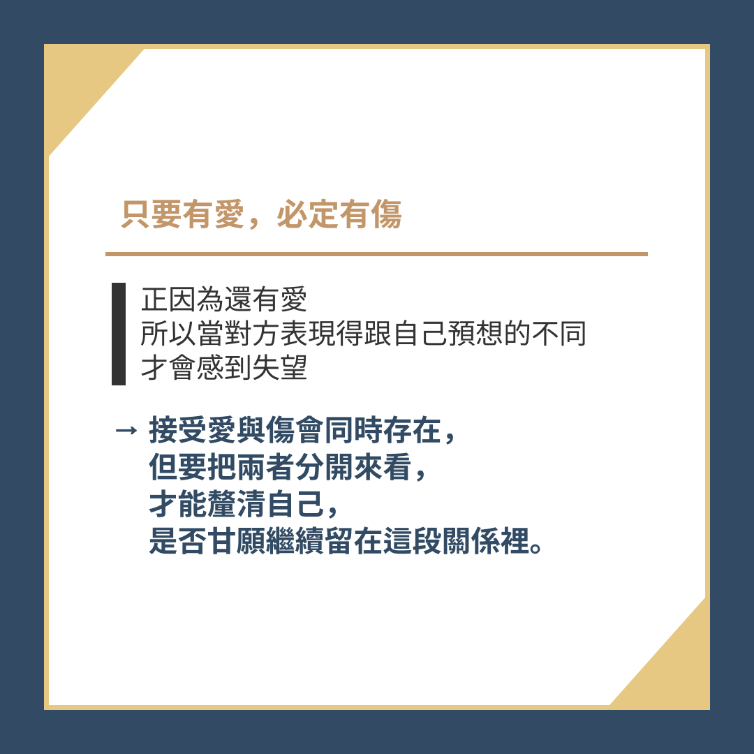 接受愛與傷會同時存在,但要把「傷害」跟「愛」的表現分開來看,才能釐清自己是否甘於承受這一切,繼續留在這段關係裡。