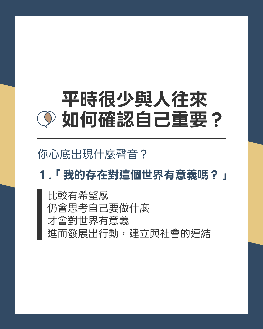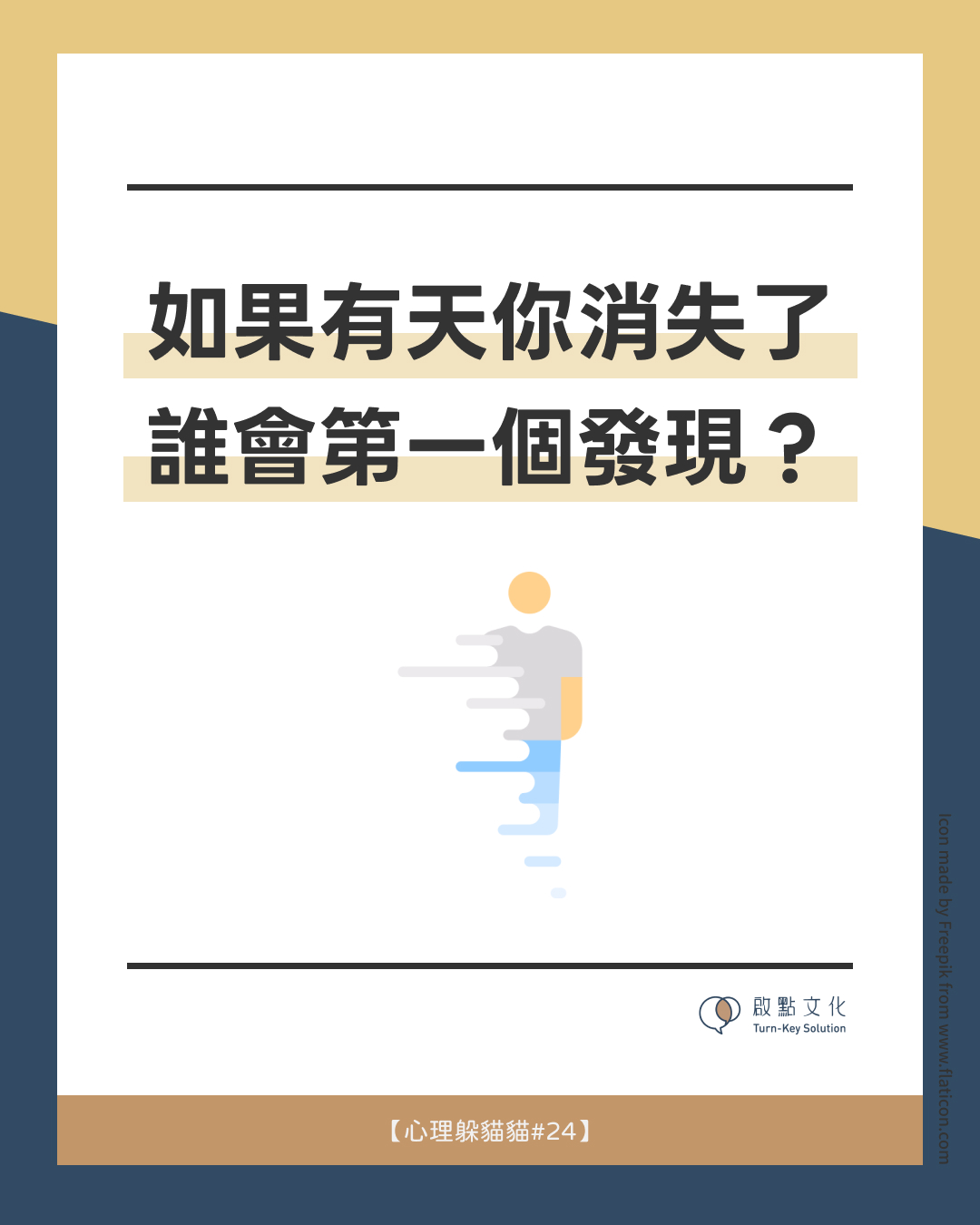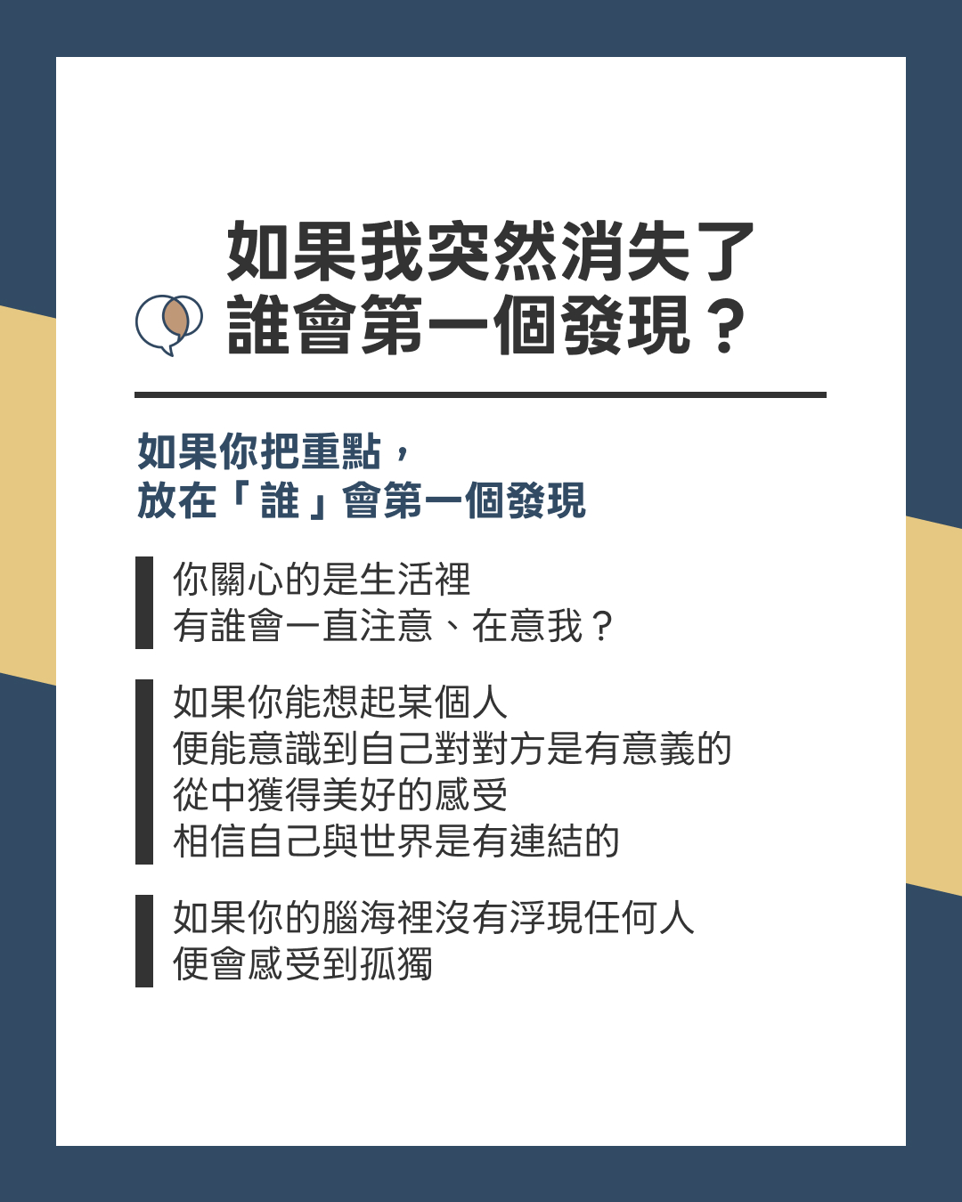 當你設想自己突然消失,會有很多人會察覺不對勁,代表你平時就很「活在關係裡」,不只生活作息皆有不同人的參與,也與很多人有心理連結