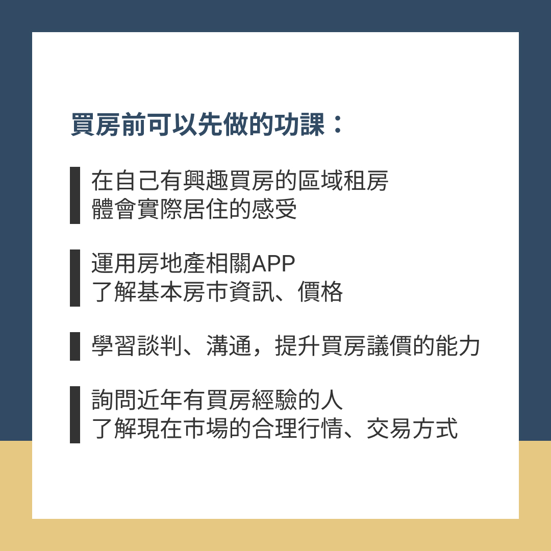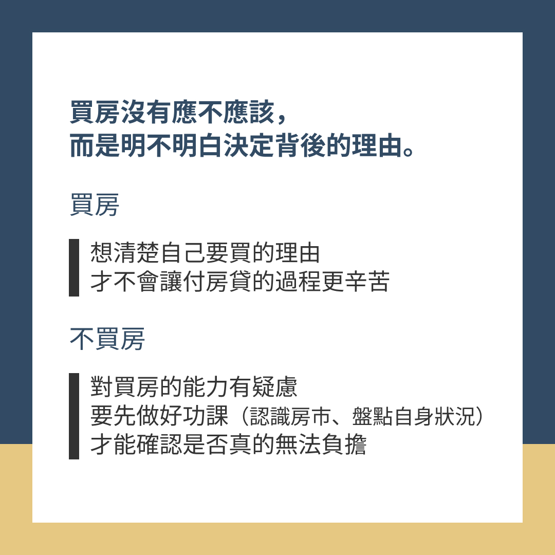 不買房:對自己買房的能力有疑慮,需要先做好功課(認識房市、盤點自身狀況),才能確認是否真的無法負擔