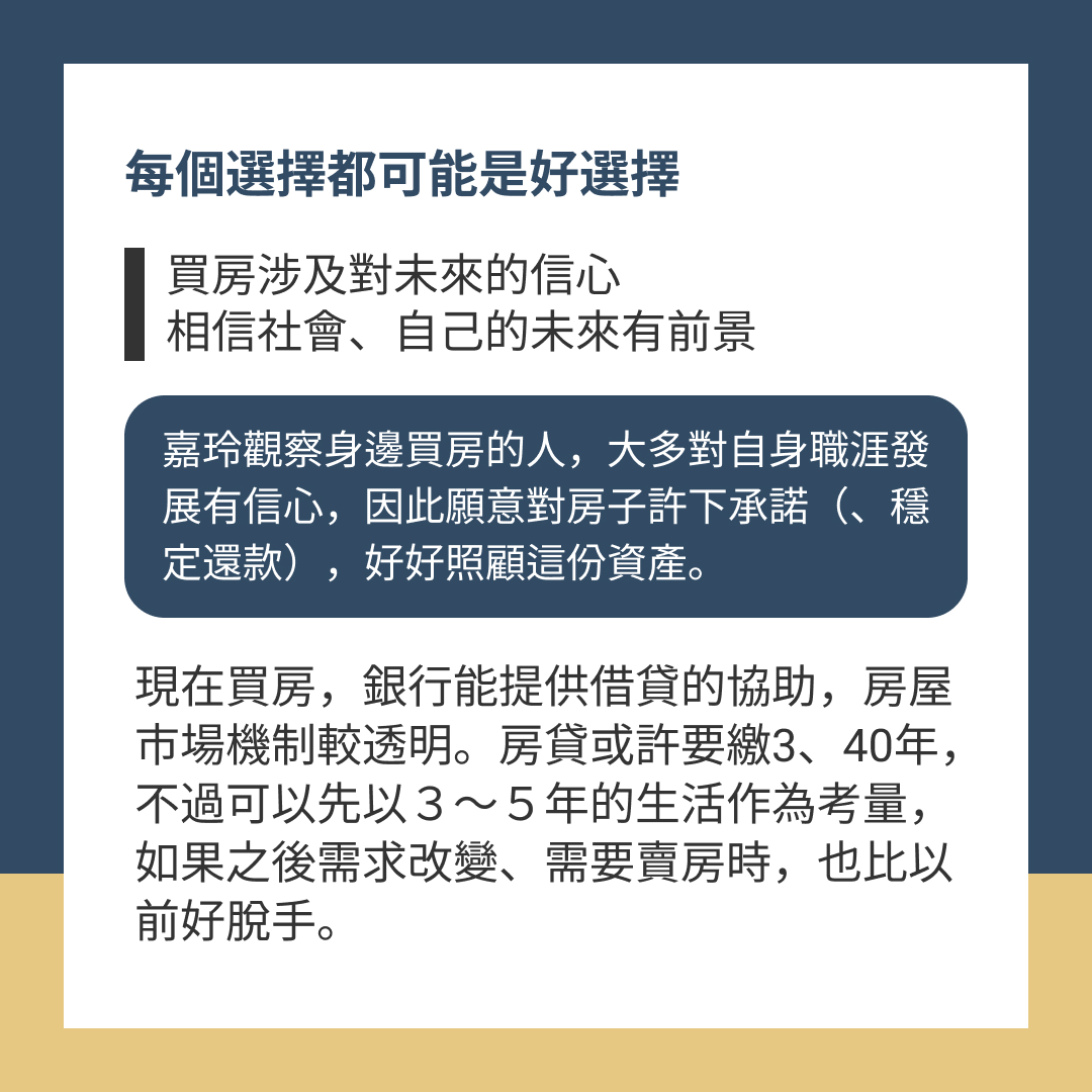 嘉玲觀察身邊買房的人,大多對自身職涯發展有信心,因此願意對房子許下承諾(、穩定還款),好好照顧這份資產。