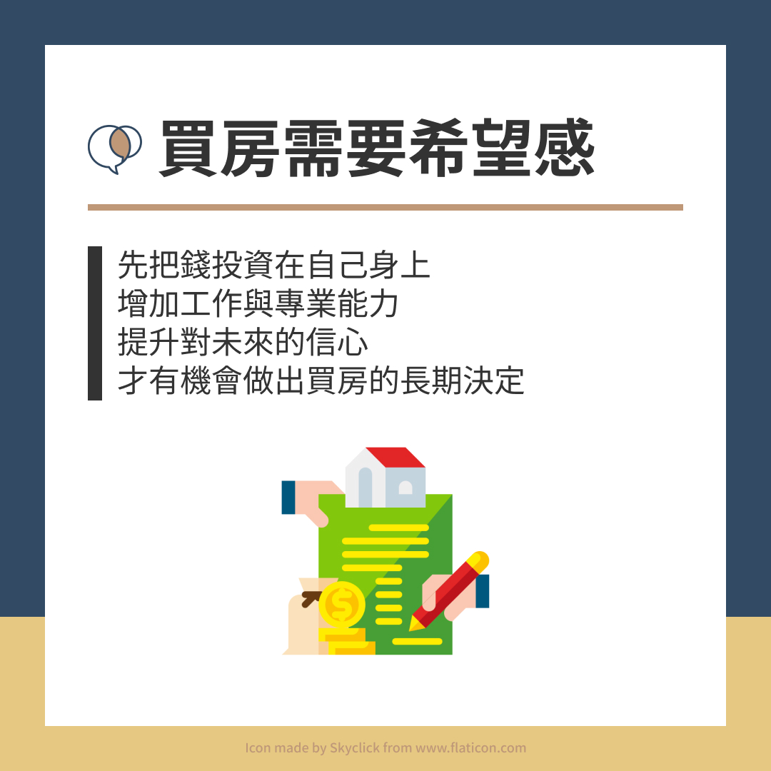 先把錢投資在自己身上,增加工作與專業能力,提升對未來的信心,才有機會做出買房的長期決定