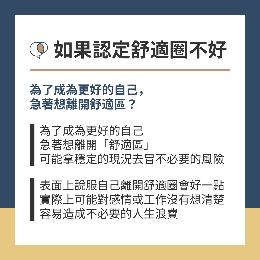 為了成為更好的自己,急著想離開「舒適區」,就有可能拿穩定的現況,去冒不必要的風險,表面上是說服自己離開舒適圈會好一點,實際上可能對自己的感情或工作沒有想清楚,容易造成不必要的人生浪費