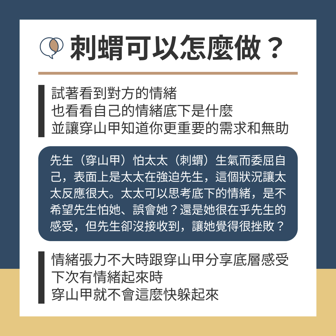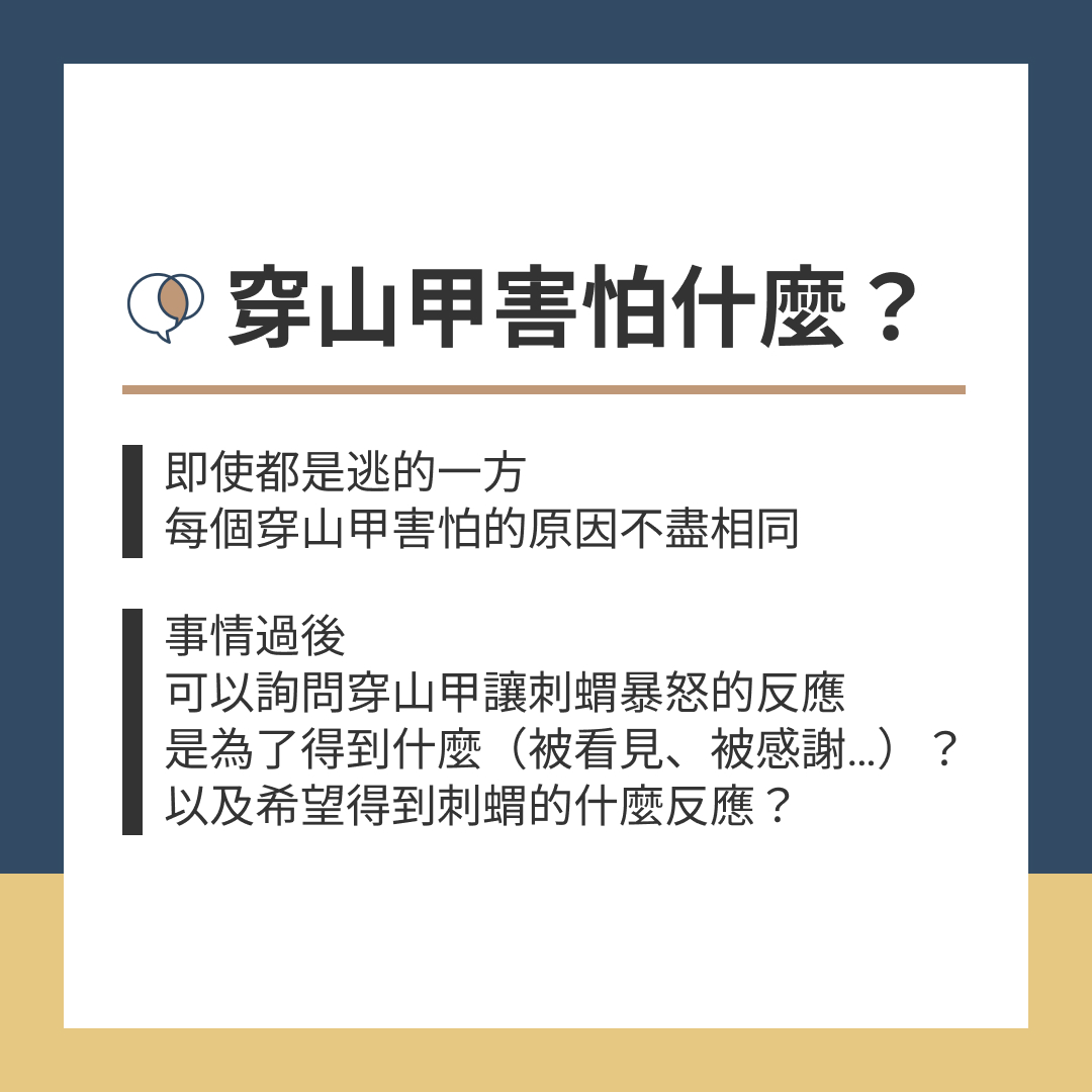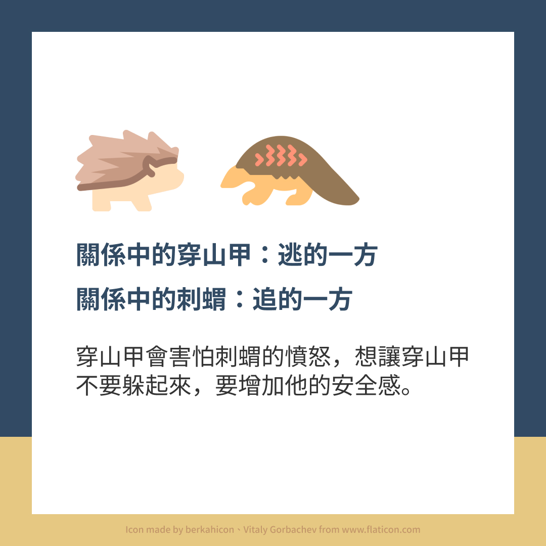 → 穿山甲(逃的一方)會害怕刺蝟(追的一方)的憤怒,想讓穿山甲不要躲起來,要增加他的安全感。