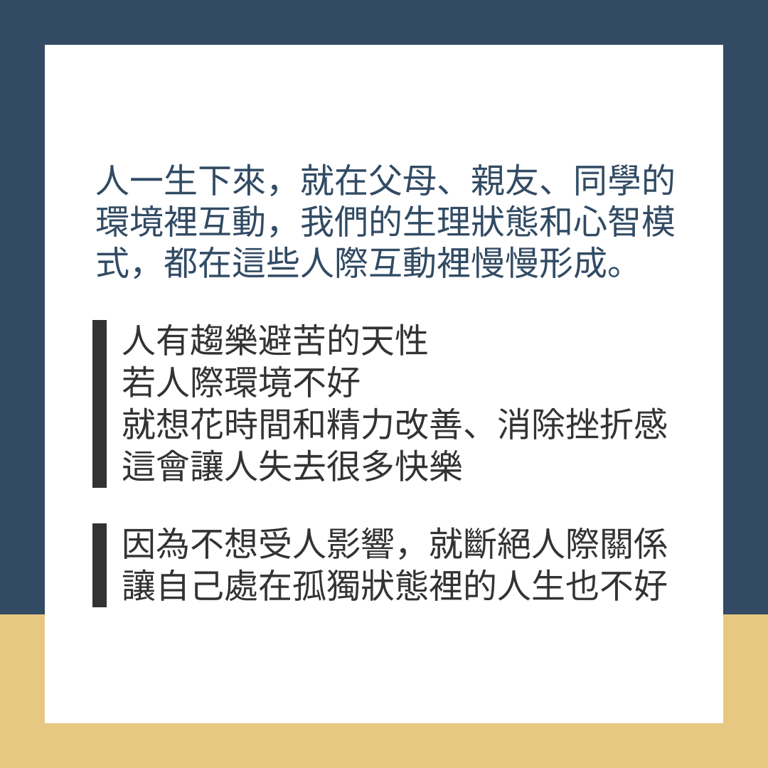 人有趨樂避苦的天性,若人際環境不好,就會想花時間和精力去改善、消除挫折感,這會讓人失去很多快樂;如果因為不想受人影響,就斷絕人際關係,讓自己處在孤獨狀態裡的人生也不好