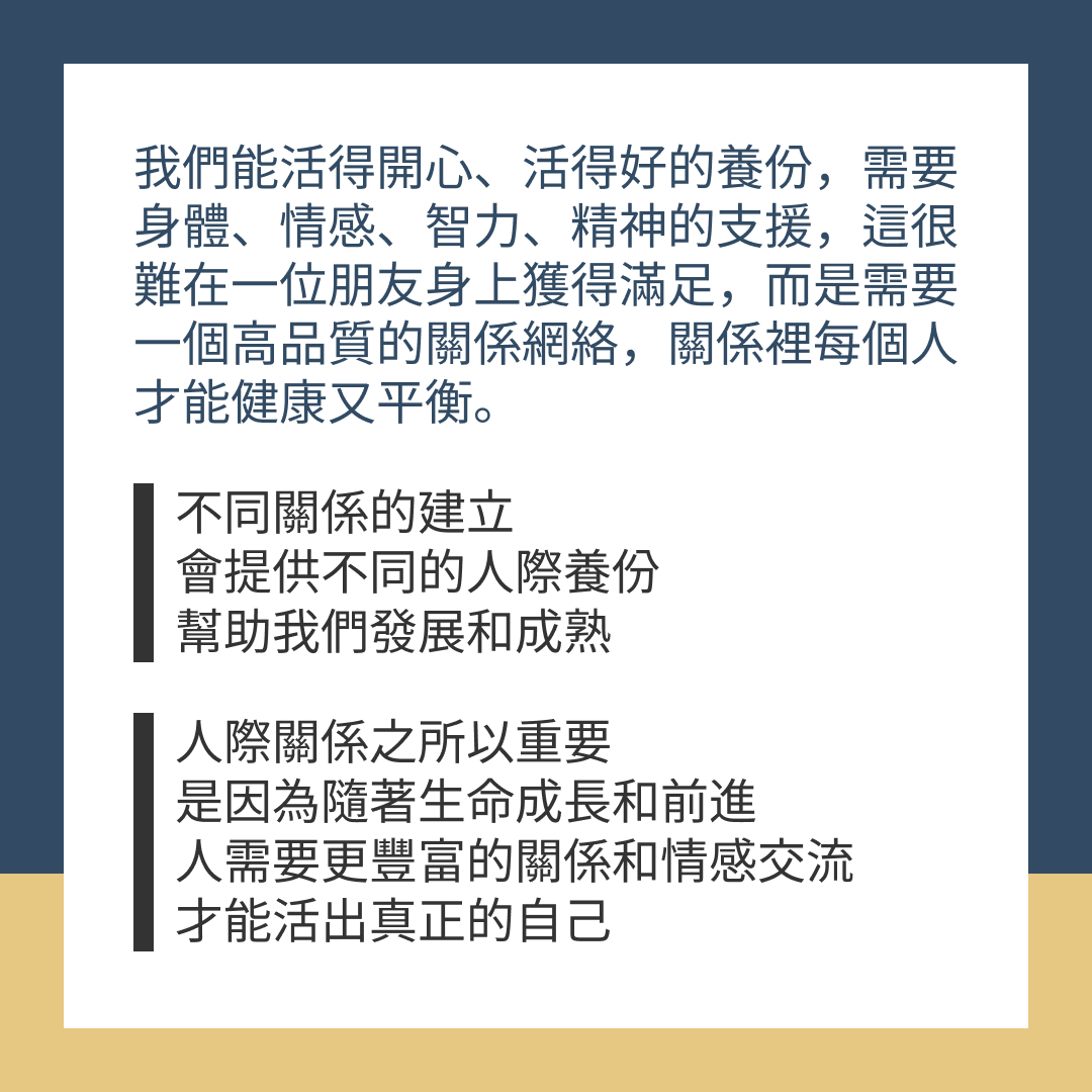 不同關係的建立,會提供不同的人際養份,幫助我們發展和成熟