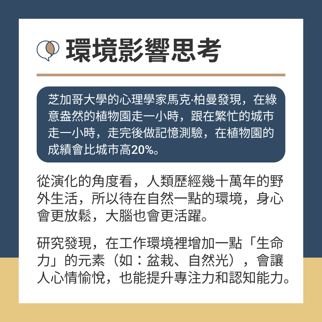 研究發現,如果能在工作環境裡,增加一點「生命力」的元素(如:盆栽、自然光),不只會讓人心情愉悅,也能提升專注力和認知能力