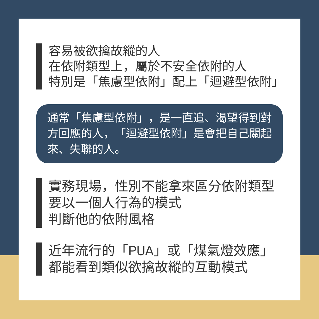 - 近年流行的「PUA」或「煤氣燈效應」,都能看到類似欲擒故縱的互動模式
