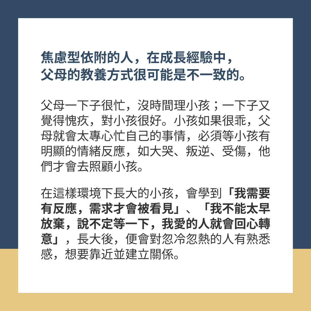 焦慮型依附的人,在成長經驗中,父母的教養方式很可能是不一致的