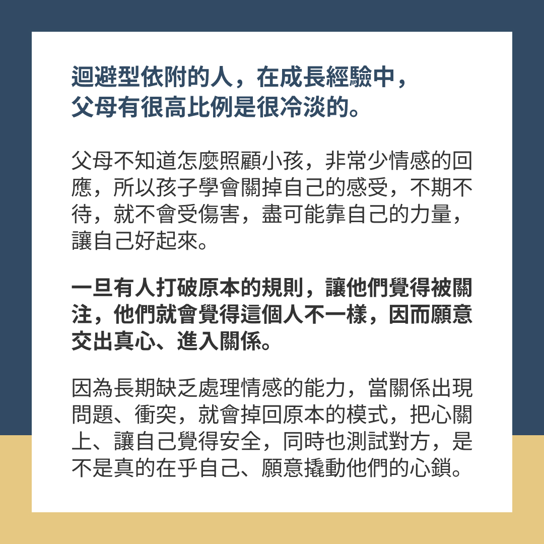 迴避型依附的人,在成長經驗中,父母有很高比例是很冷淡的