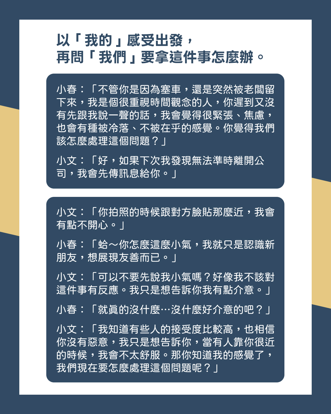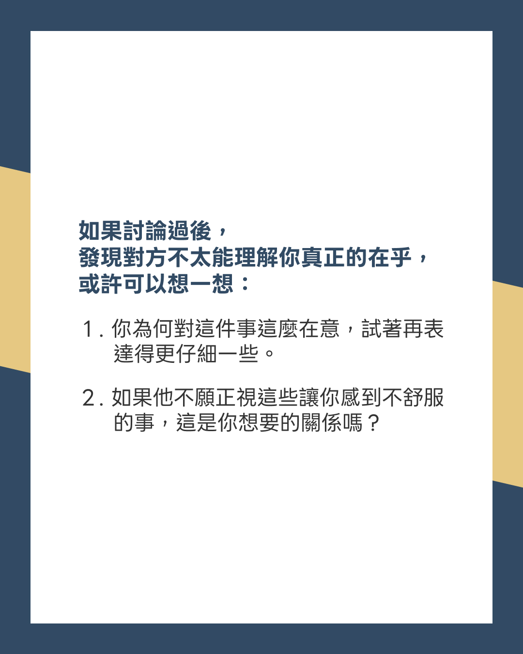 → 如果討論過後,發現對方不太能理解你真正的在乎,或許可以想一想: