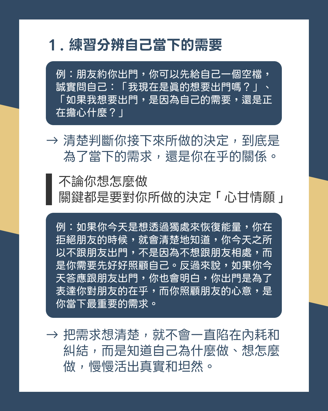 → 清楚判斷你接下來所做的決定,到底是為了你當下的需求,還是為了你在乎的關係。
