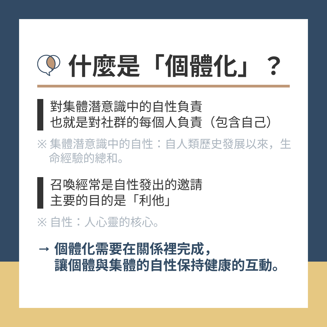 → 個體化需要「在關係裡完成」,讓個體與集體的自性保持健康的互動。