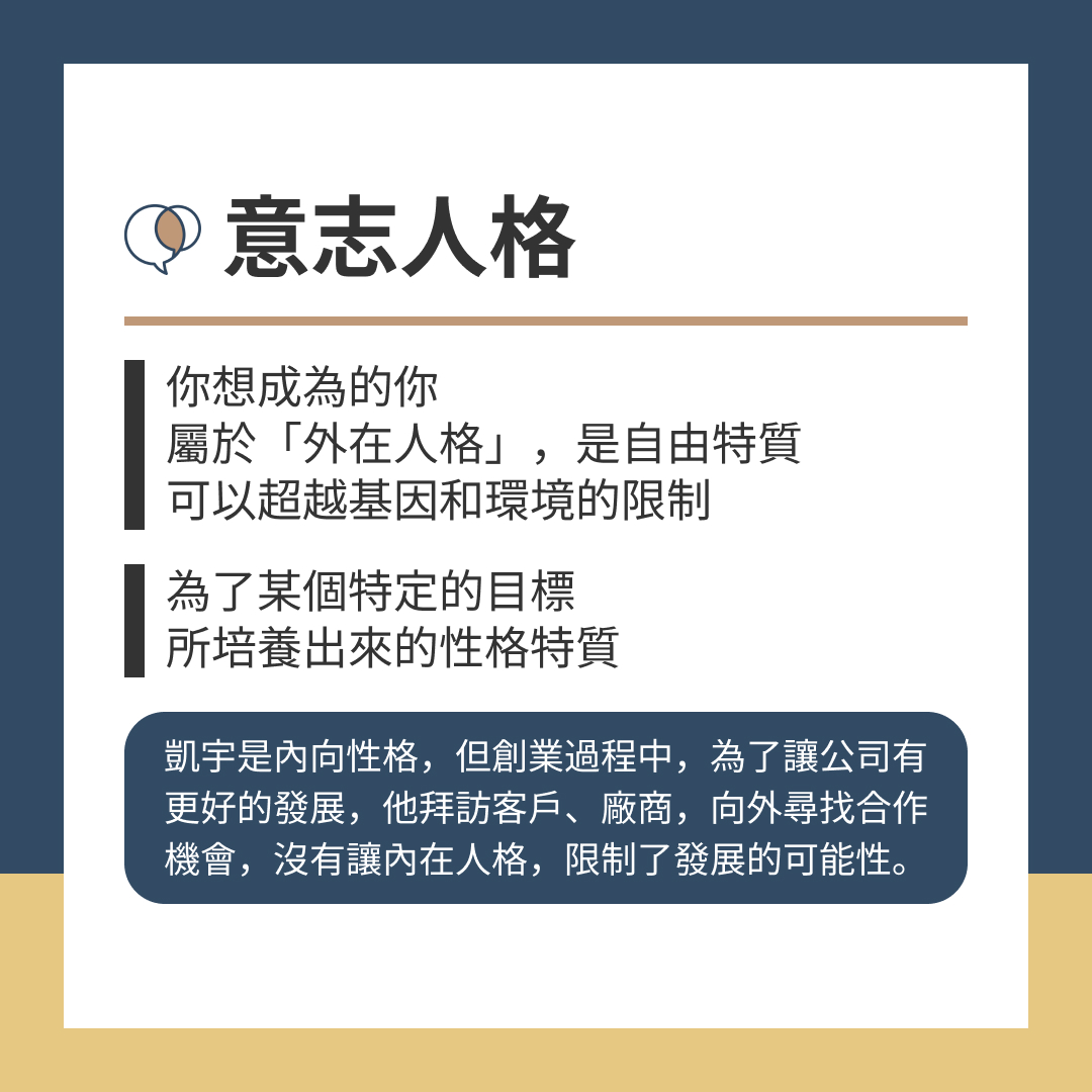 學員的生理人格、社會人格都是內向者,但他因為期許自己成為那位講者,所以不斷修練自己的相反邊,讓自己具備外向者的能力。