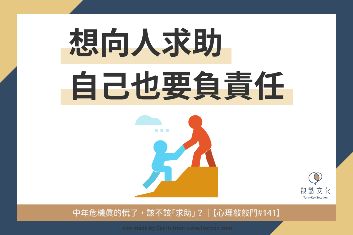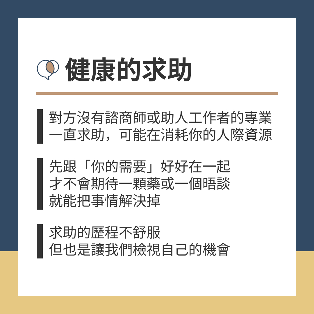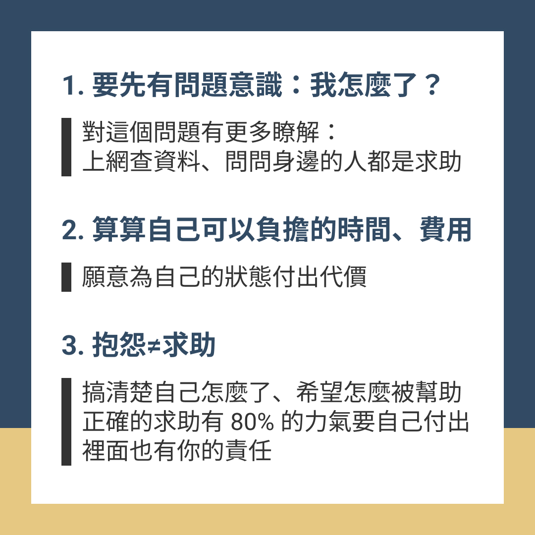 → 要搞清楚自己怎麼了、能說出自己希望怎麼被幫助,因為正確的求助,有80%的力氣是要自己付出的,裡面也有你的責任