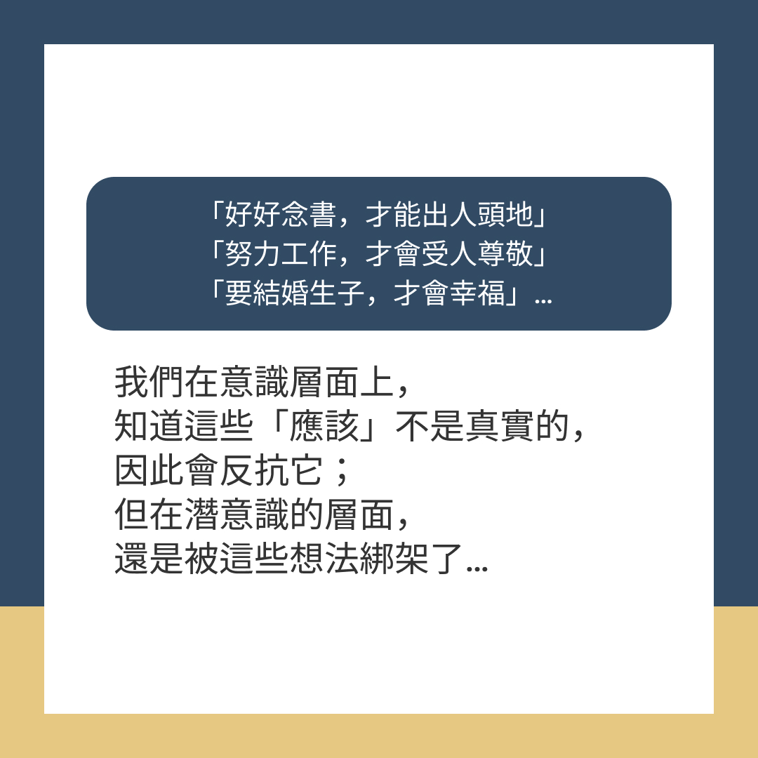 很多人在意識層面上,知道這些「應該」並不是真實的,因此會反抗它,但其實在潛意識的層面,還是被這些想法綁架了。