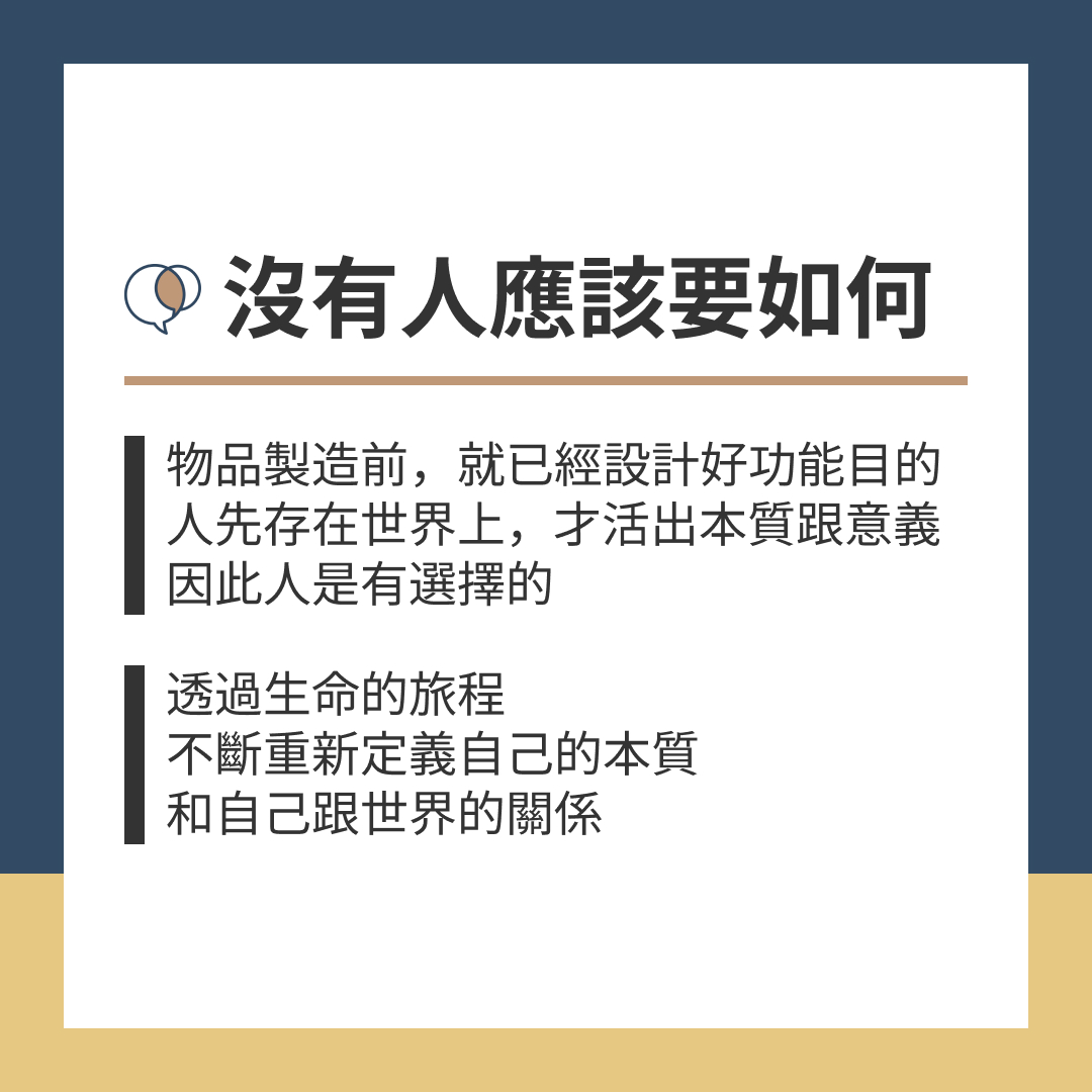人先存在這個世界上,才活出自己本質跟意義,因此人是有選擇的,沒有人「應該」要如何
