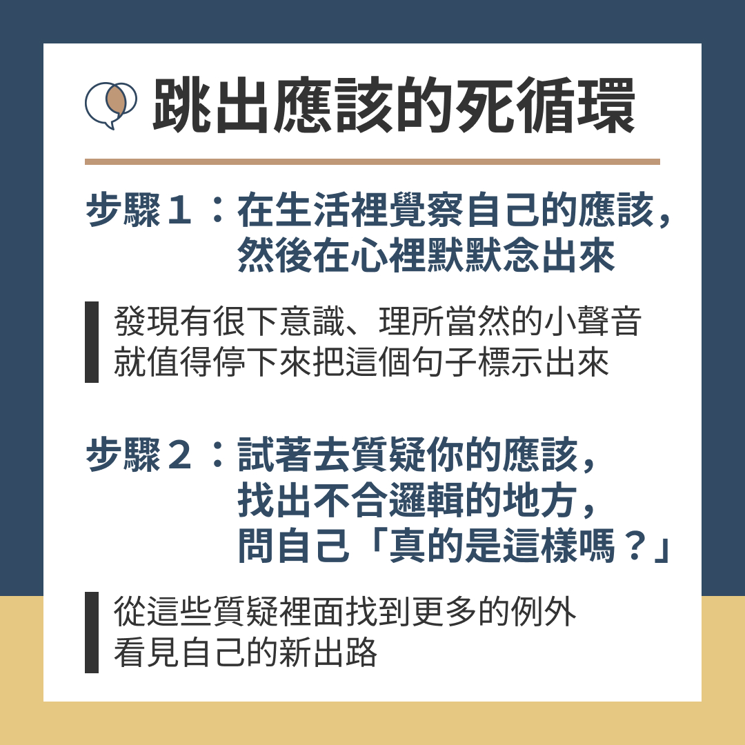 步驟2:試著去質疑你的應該,找出裡面不合邏輯的地方,然後問問自己「真的是這樣嗎?」