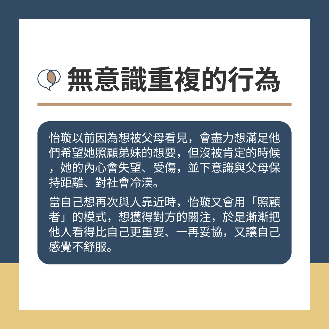 怡璇想被父母看見,因此盡力想滿足,他們希望怡璇照顧弟妹的想要,但是沒被肯定的時候,內心會失望、受傷,並下意識與父母保持距離、對社會冷漠。