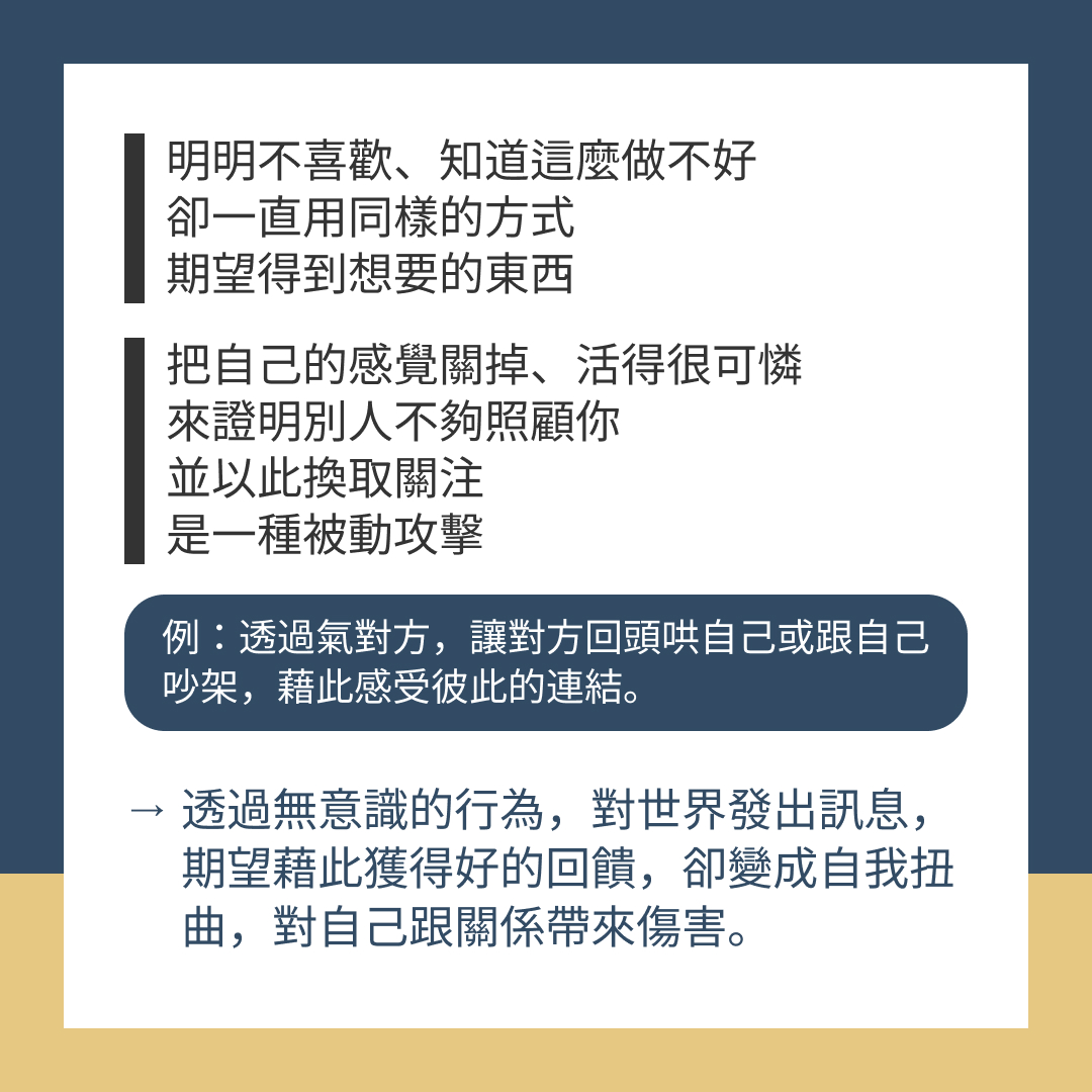 把自己的感覺關掉、活得很可憐,來證明別人不夠照顧你,並以此換取關注,是一種被動攻擊