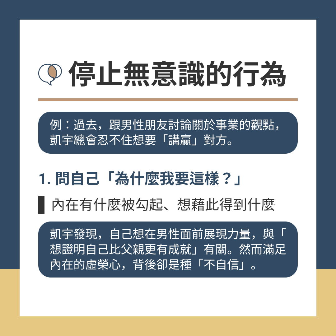 凱宇發現,自己想在男性面前展現力量,與「想證明自己比父親更有成就」有關。然而滿足內在的虛榮心,背後卻是種「不自信」。