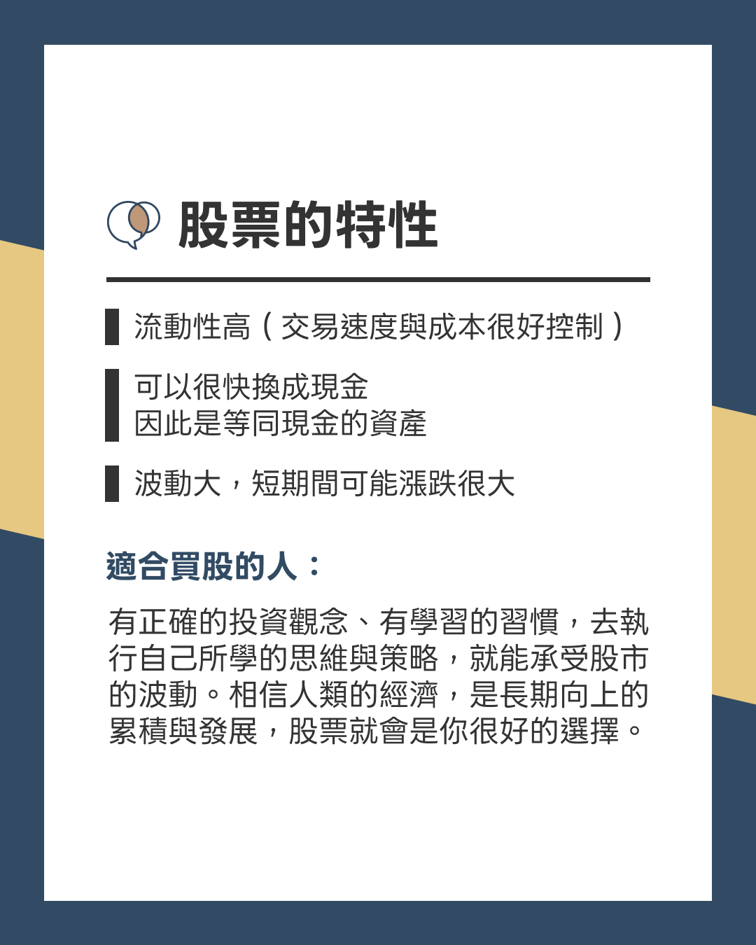 適合買股的人:有正確的投資觀念,並且有學習的習慣,去執行自己所學的思維與策略,就能承受股市的波動。相信人類的經濟,是長期向上的累積與發展,股票就會是你很好的選擇