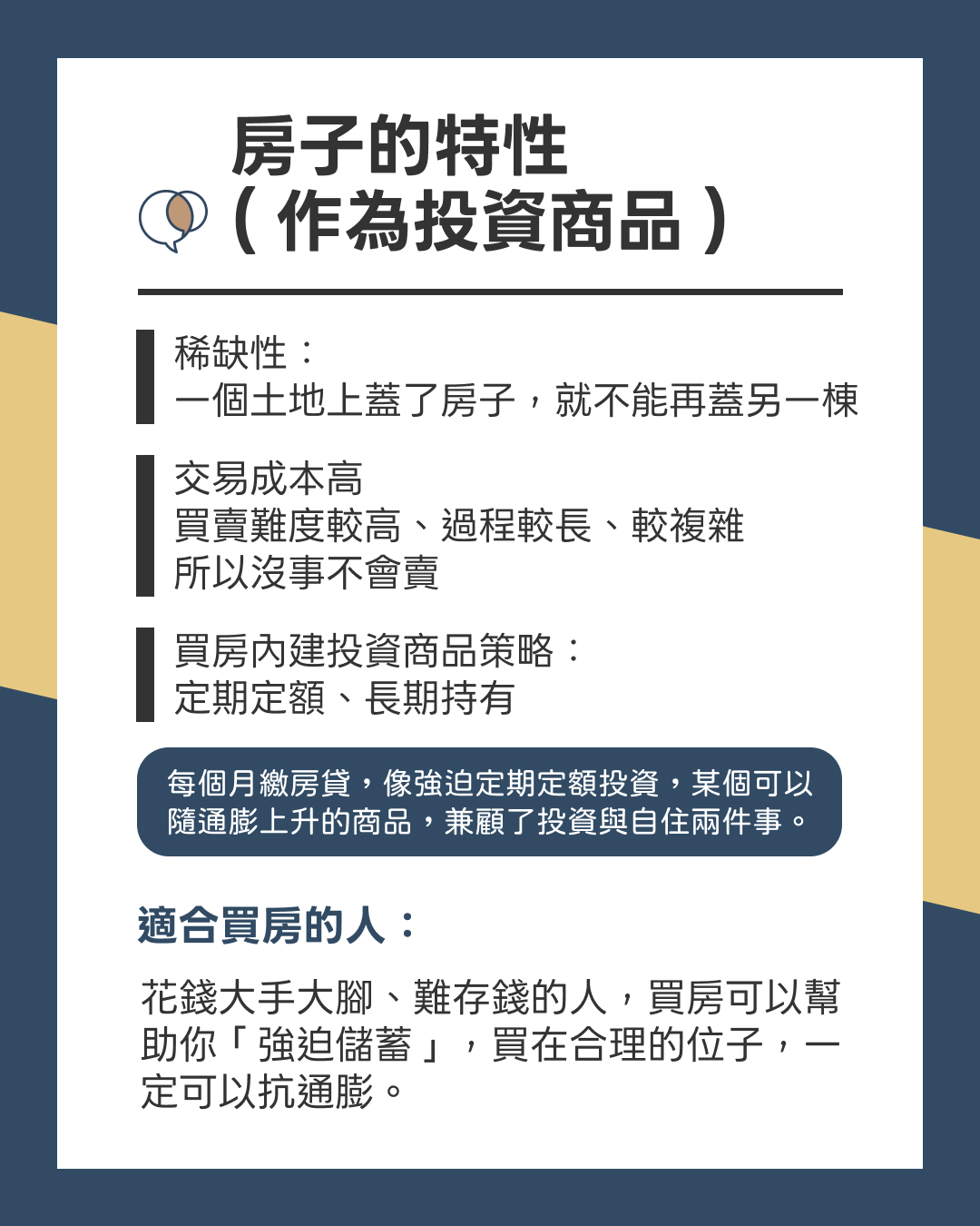 每個月繳房貸,像強迫定期定額投資,某個可以隨通膨上升的商品,兼顧了投資與自住兩件事。